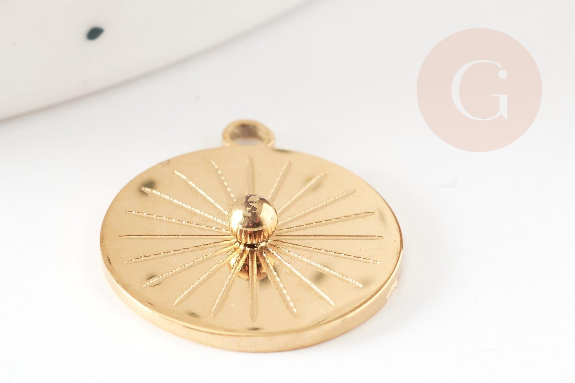 Discover our round pendant in 304 stainless steel, gilded with a 14K gold IP finish , decorated with a sun motif. This pendant brings a touch of luck and sparkle to your jewelry creations. Each order includes one round stainless steel sun pendant.