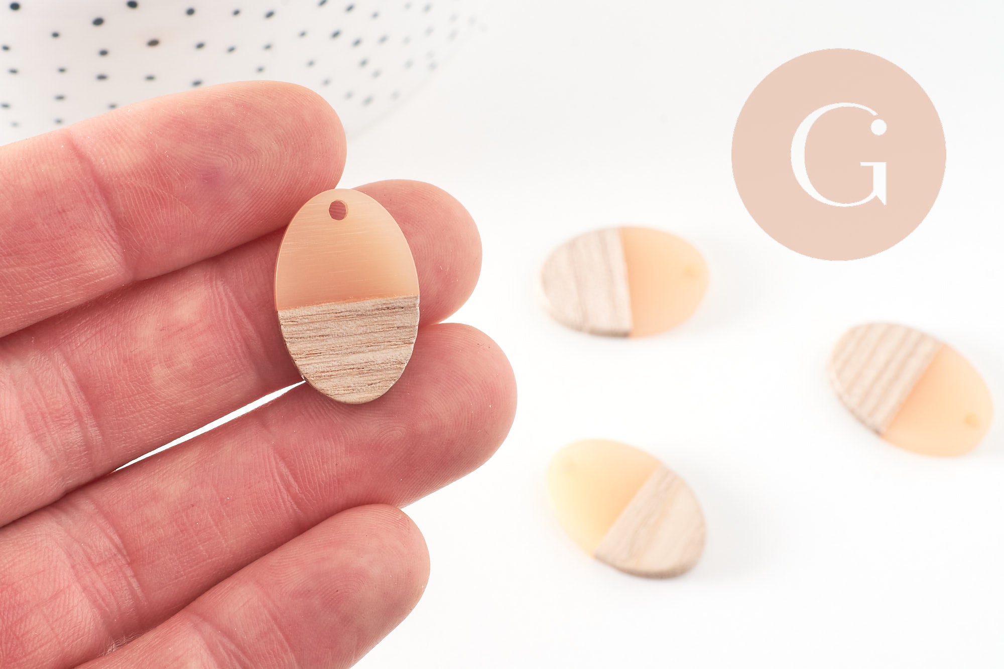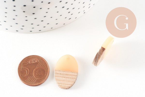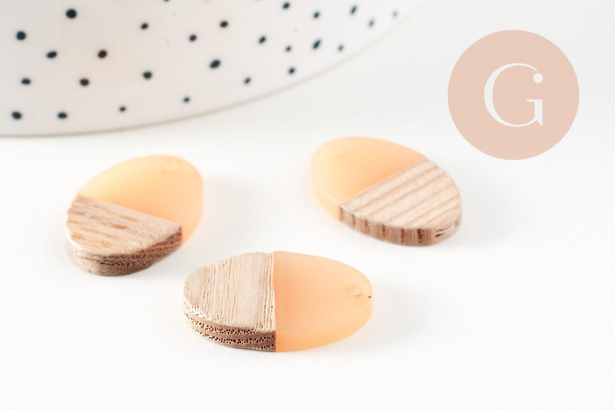 Very simple-looking oval beads, made of wood and resin, which can make very pretty pendants or complete earrings in a geometric style, in light wood and light pink resin.