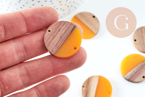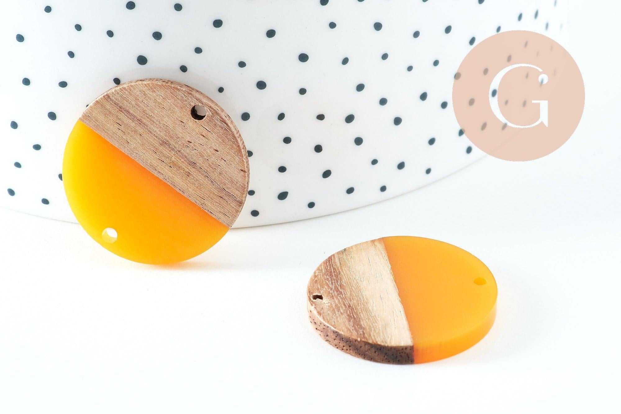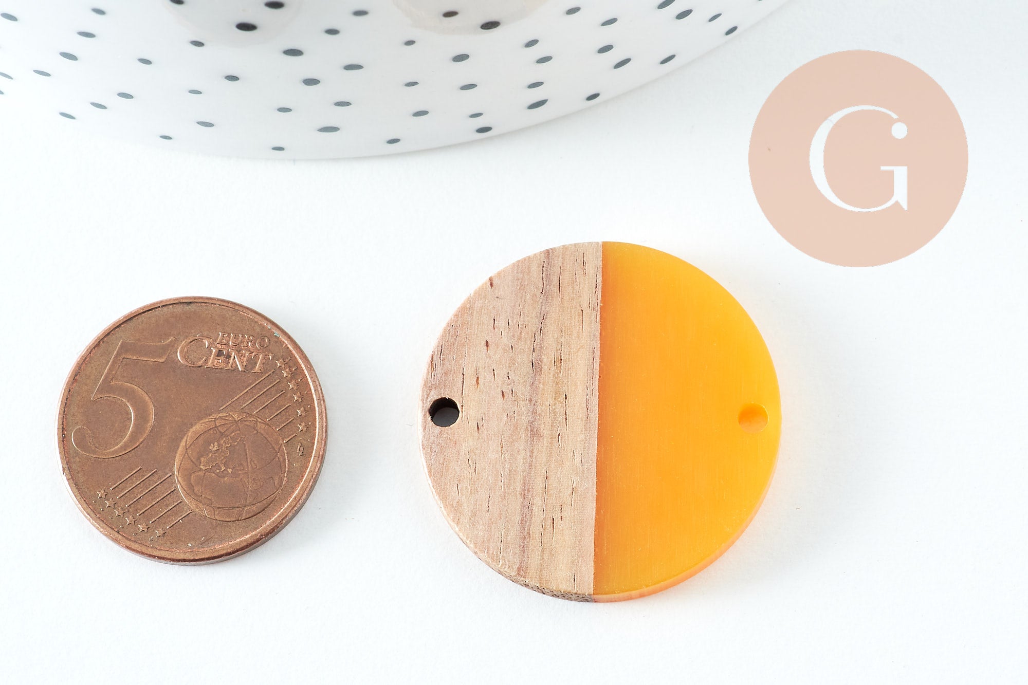 Pendentif disque bois résine jaune 27.5mm,création bijoux bois, x5 G5128