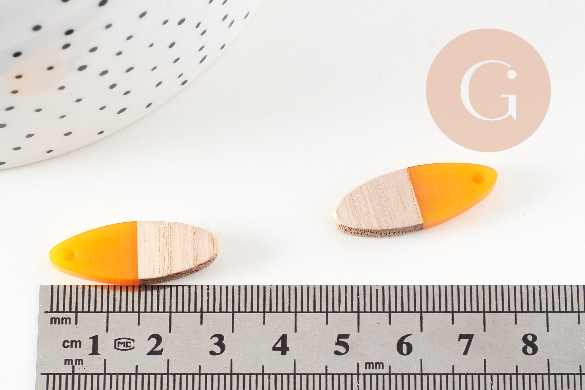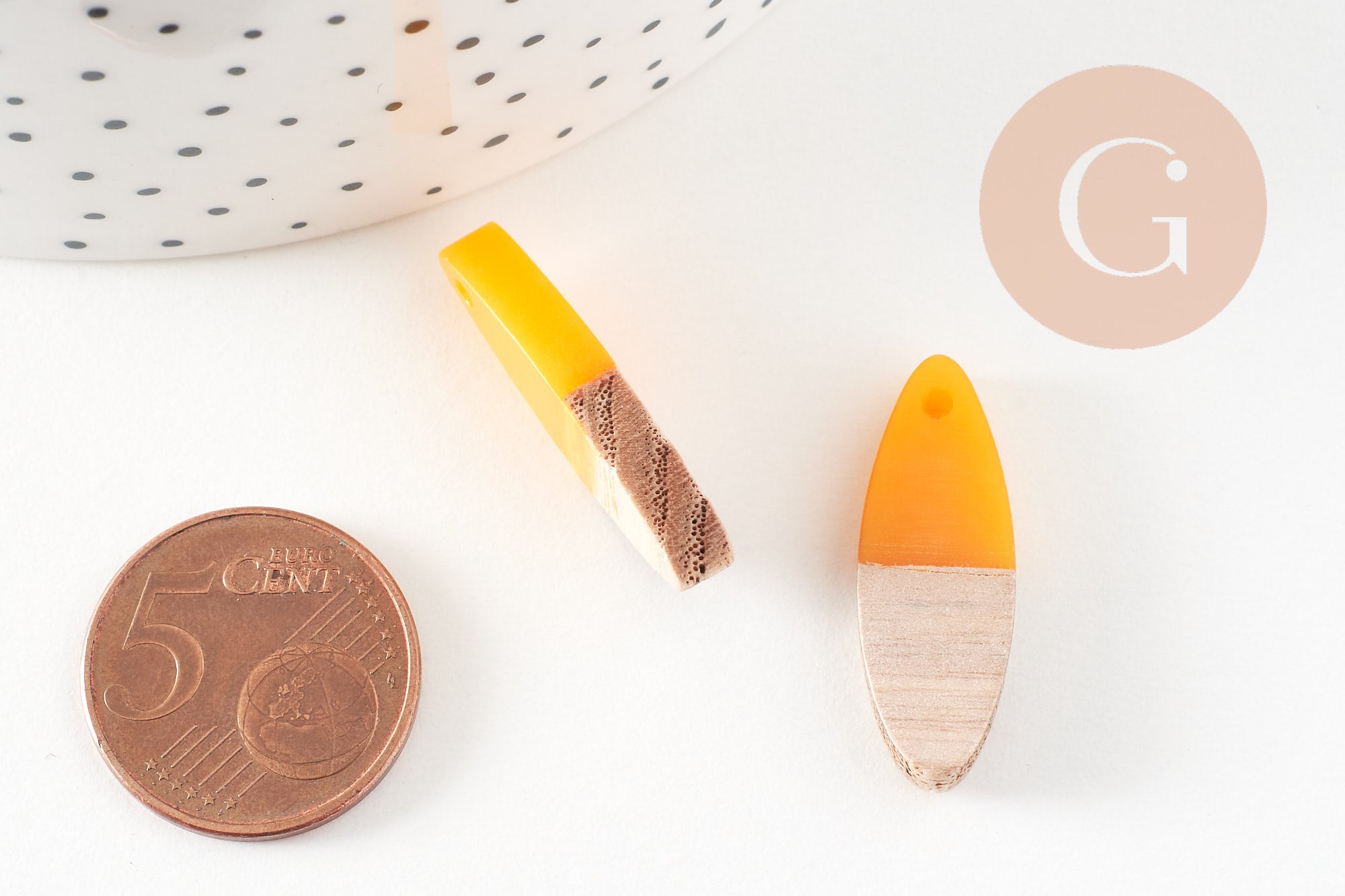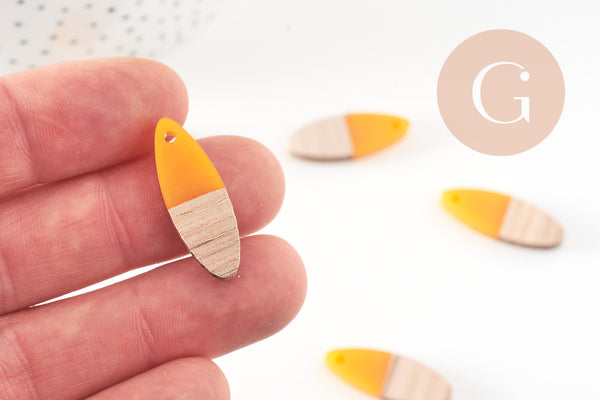 Very simple-looking oval beads, made of wood and colored resin, which can make very pretty pendants or complete earrings in a geometric style.