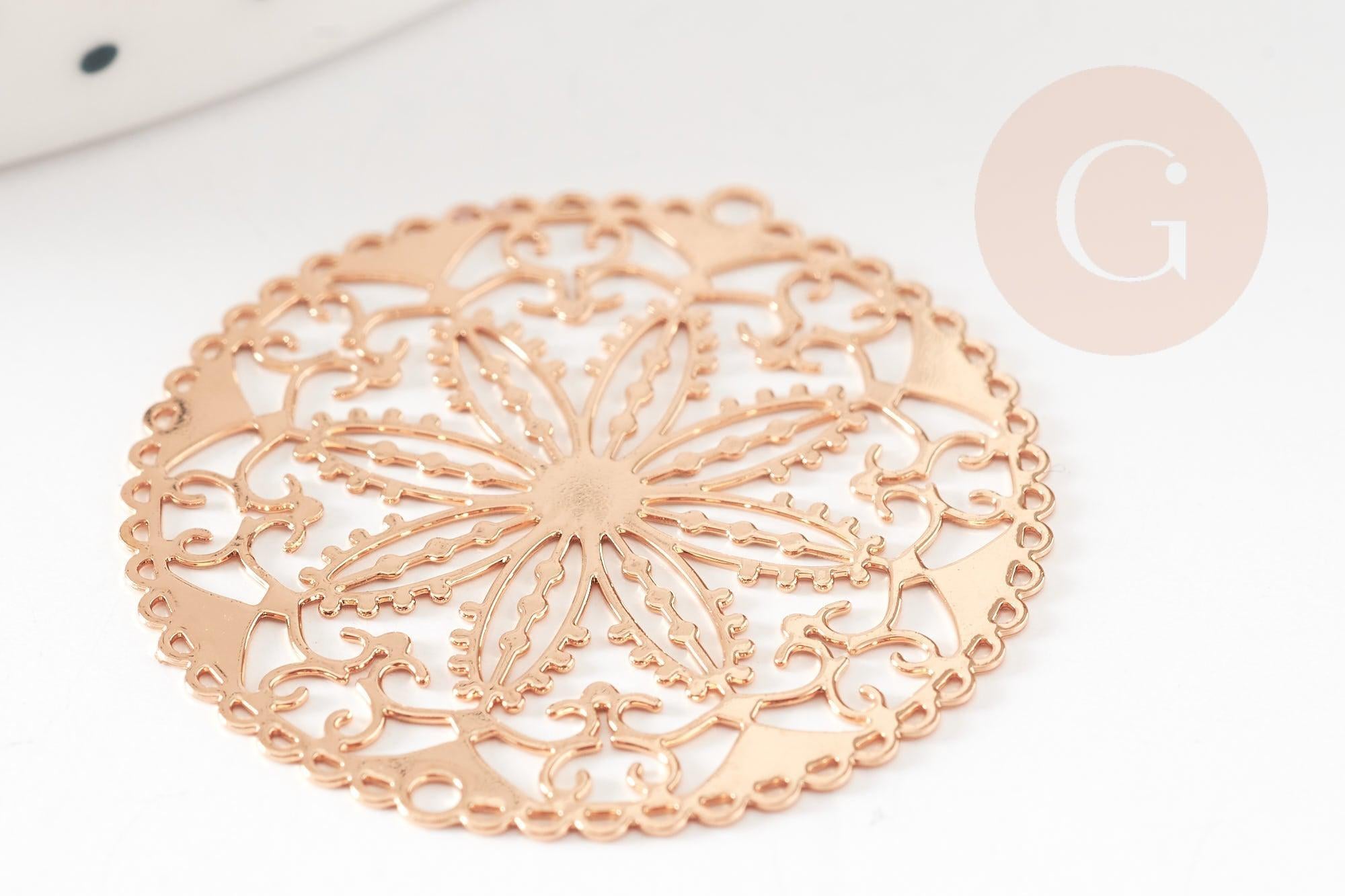 A round filigree flower print pendant in gold-plated brass . A lightweight pendant, ideal for making earrings, necklaces and long necklaces.