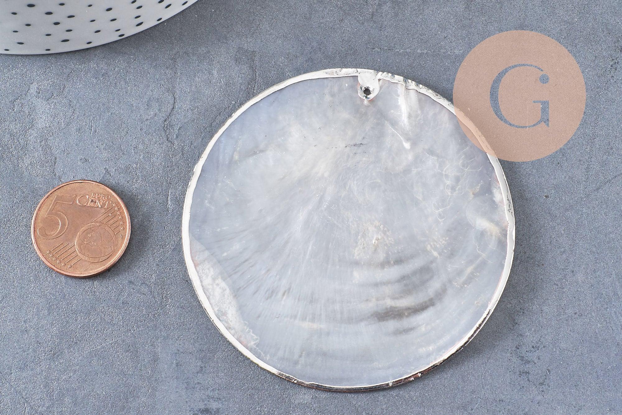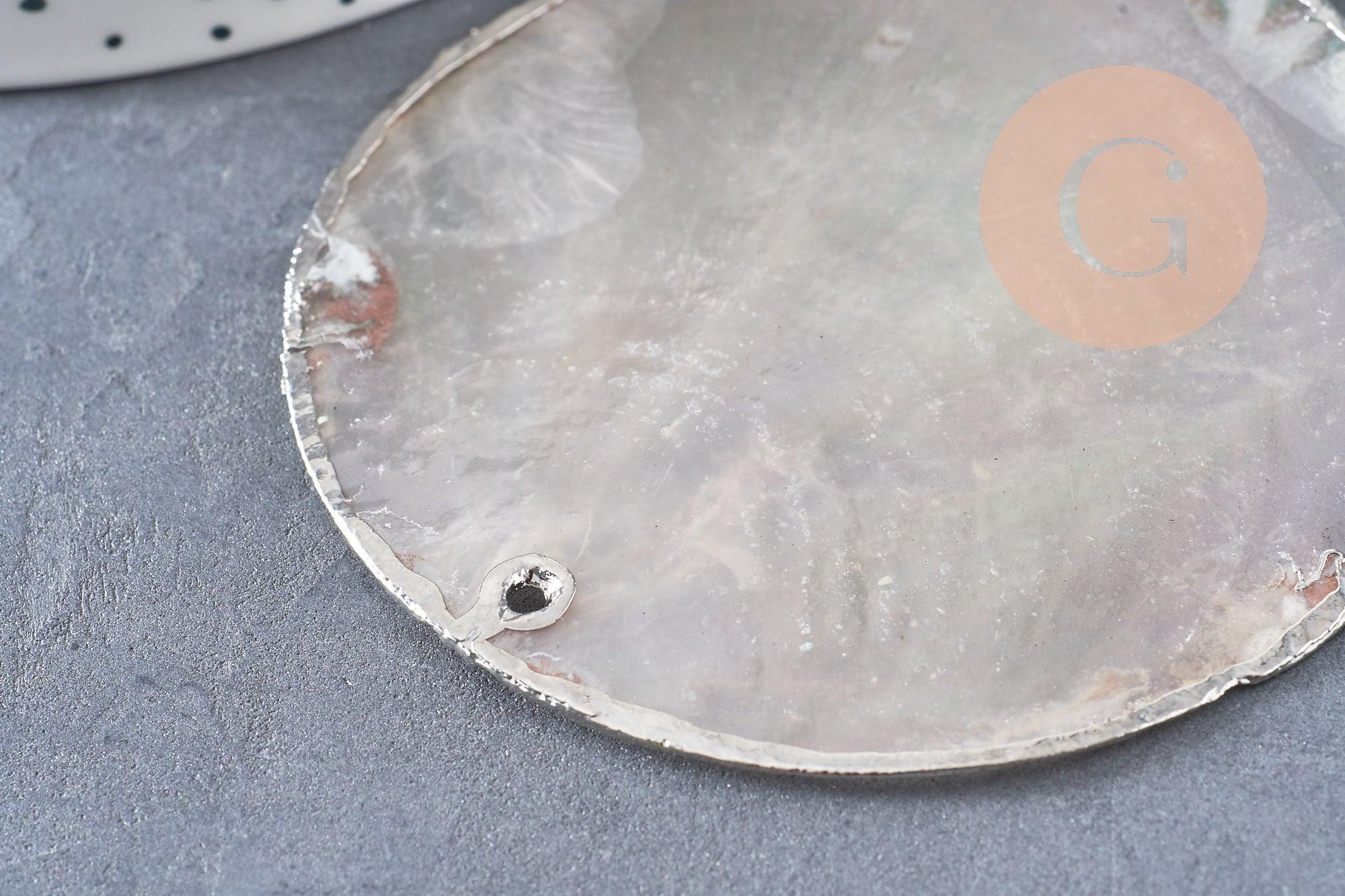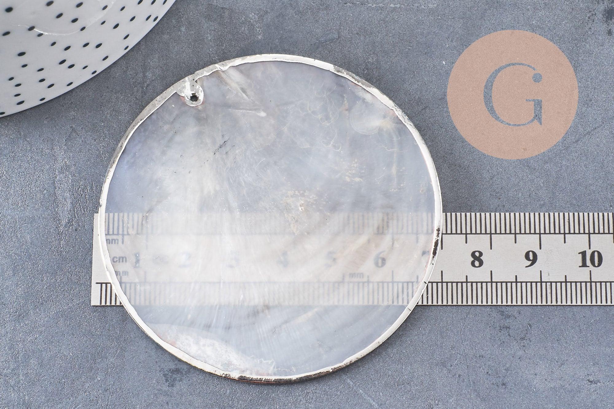 Round white mother-of-pearl pendant in silver, shell pendant, white shell, natural shell, jewelry creation, 70mm,-G1076