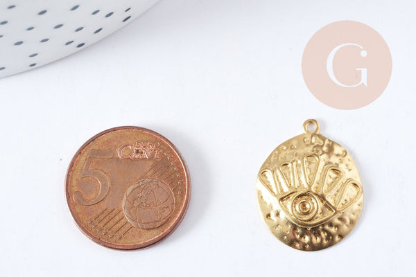 Add a touch of protection and style to your jewelry designs with this raw brass round domed protective eye medal pendant.