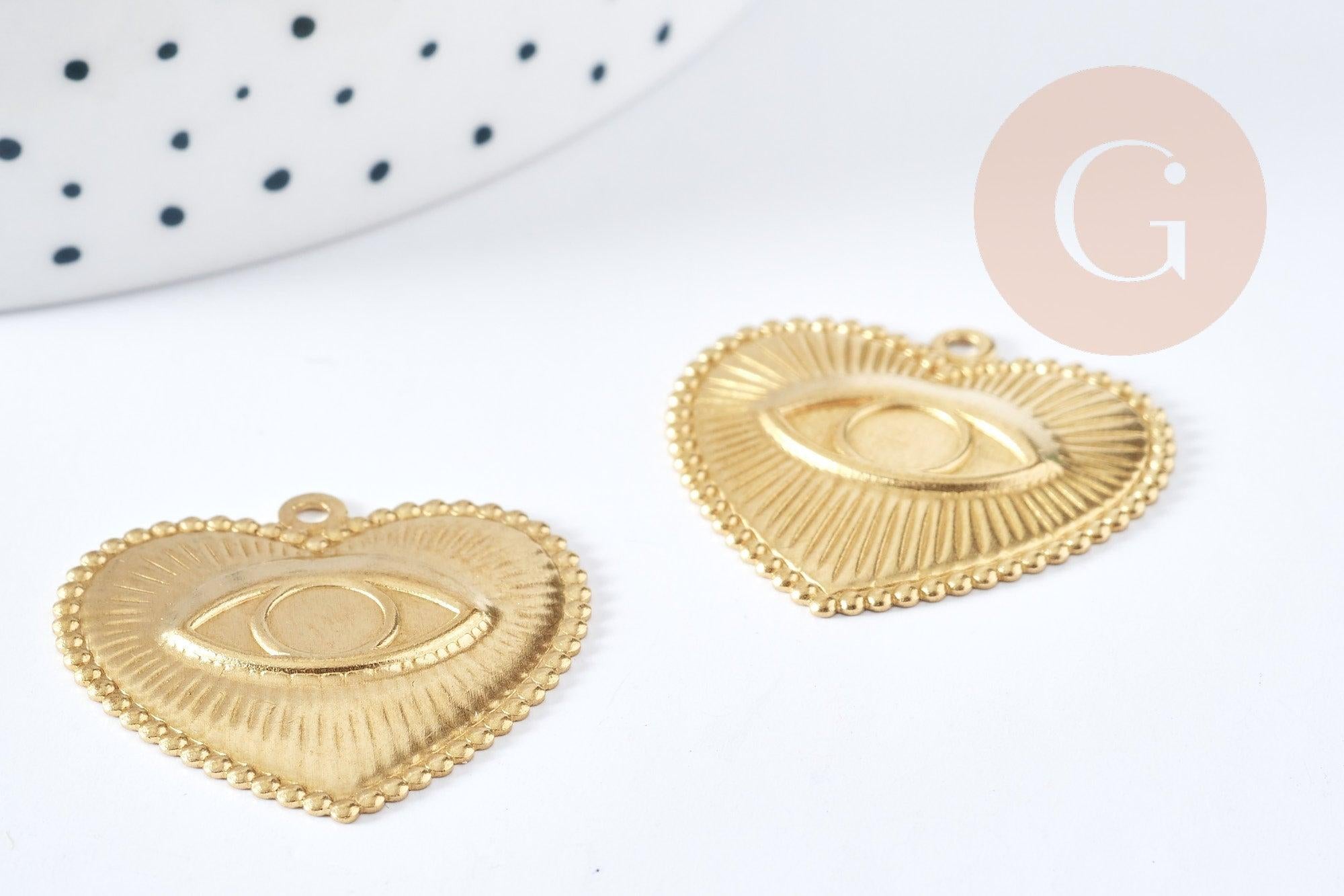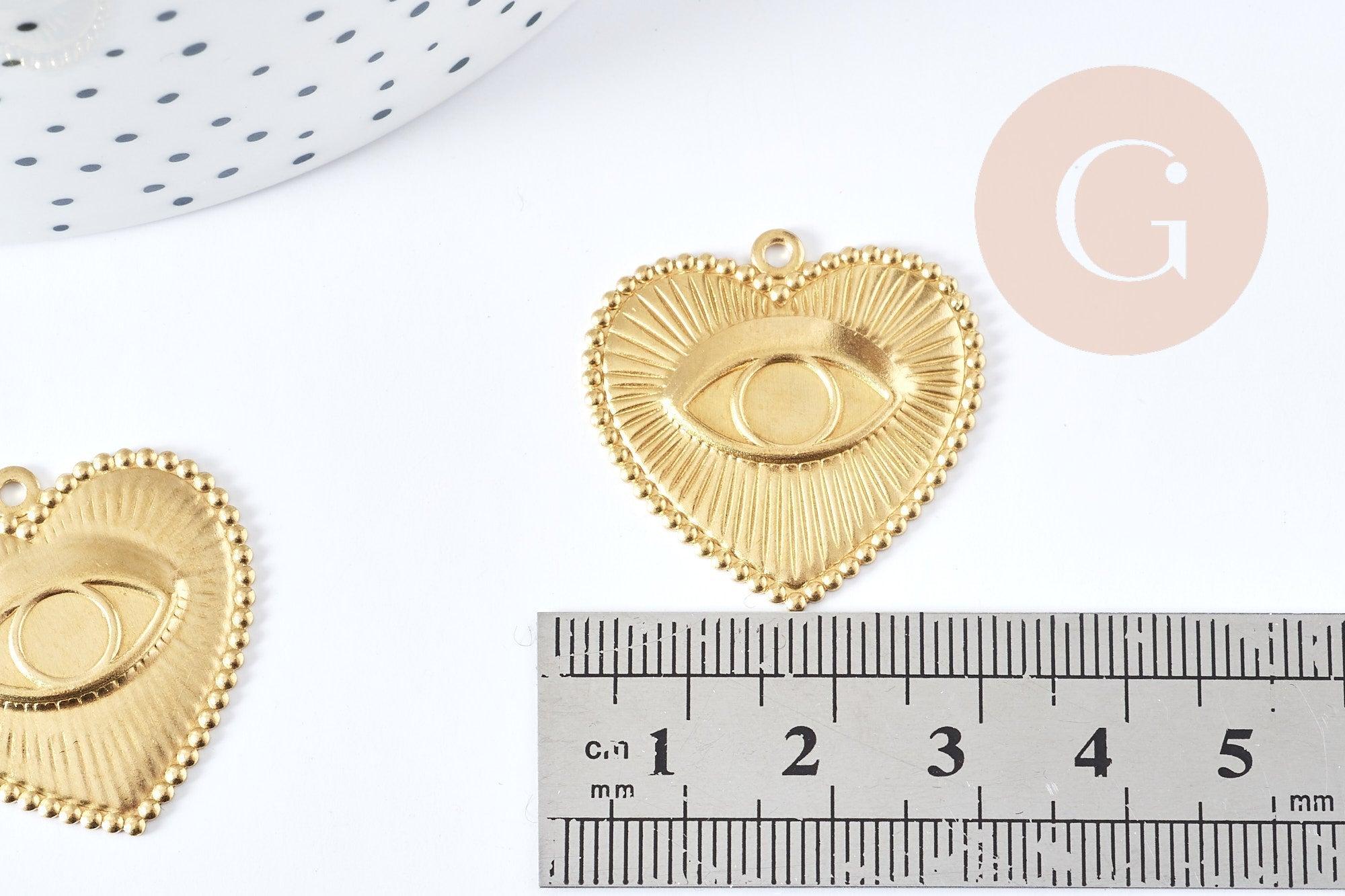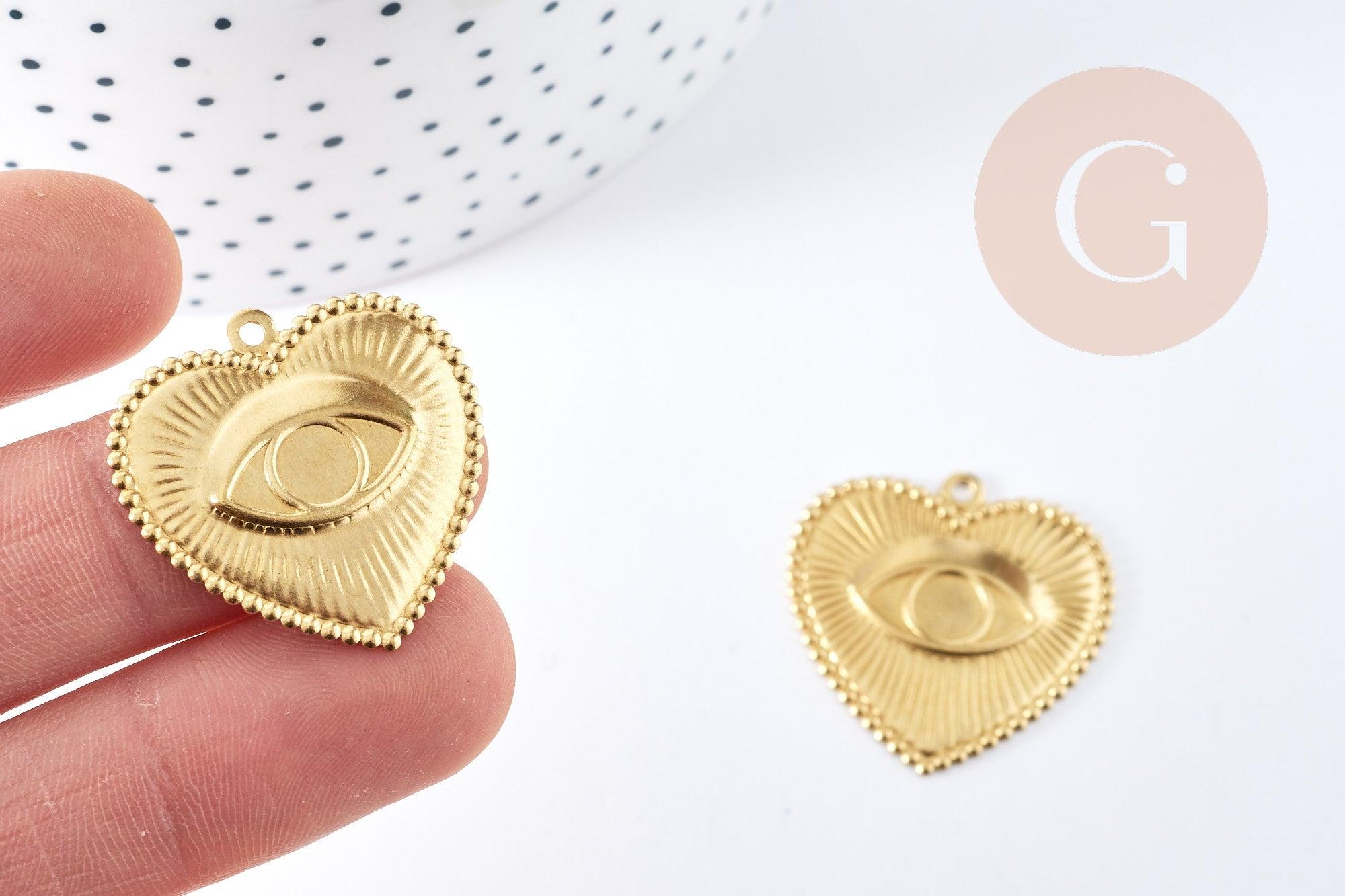 Add a touch of protection and symbolism to your jewelry designs with this raw brass "Protective Eye" heart medal pendant . Measuring 28mm in diameter, this pendant features a unique design combining the heart symbol and the protective eye, creating a piece of jewelry loaded with positive meanings.