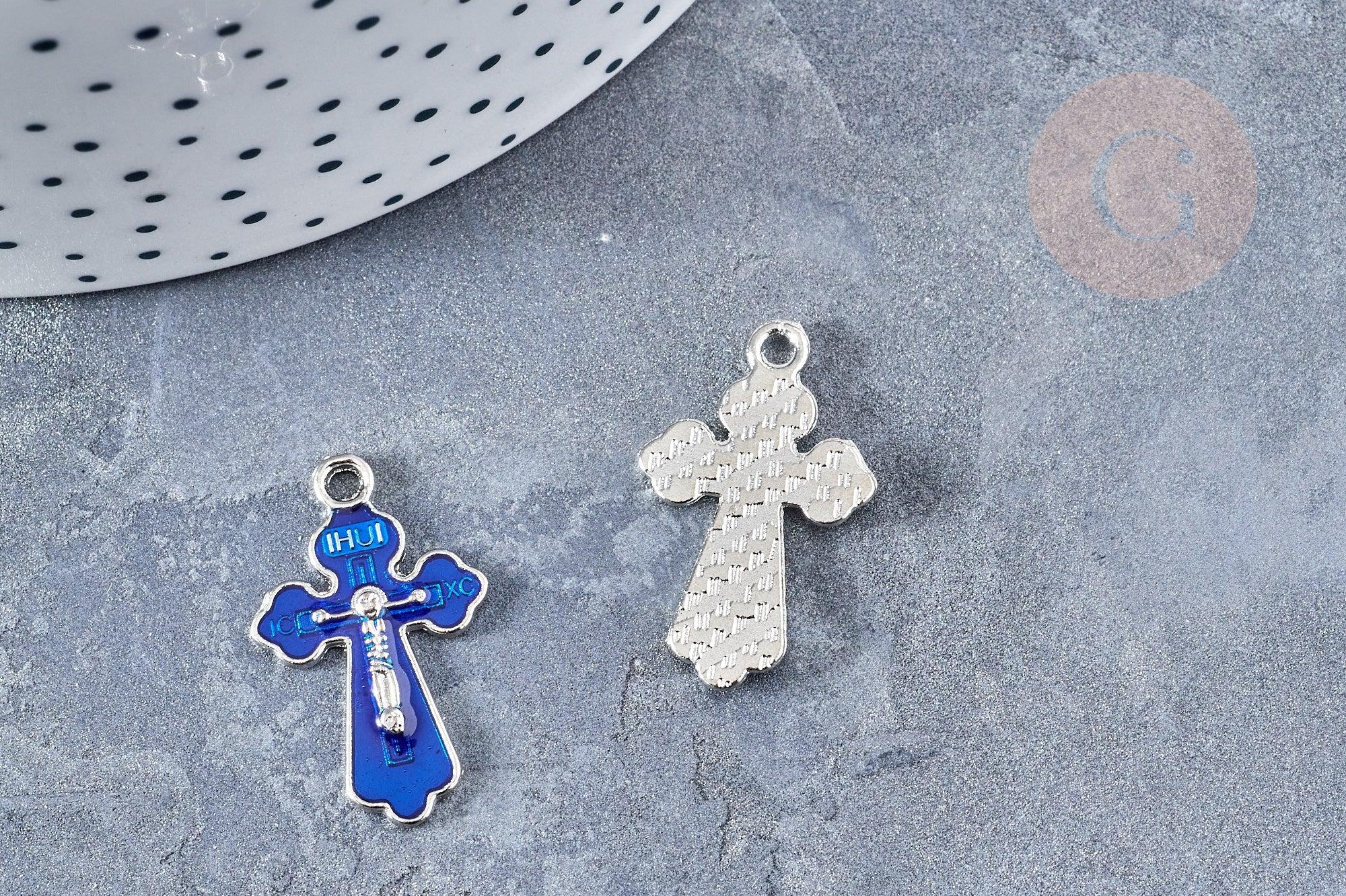 This silver zamac cross pendant coated with blue enamel is versatile and can be used in many different ways in jewelry, including