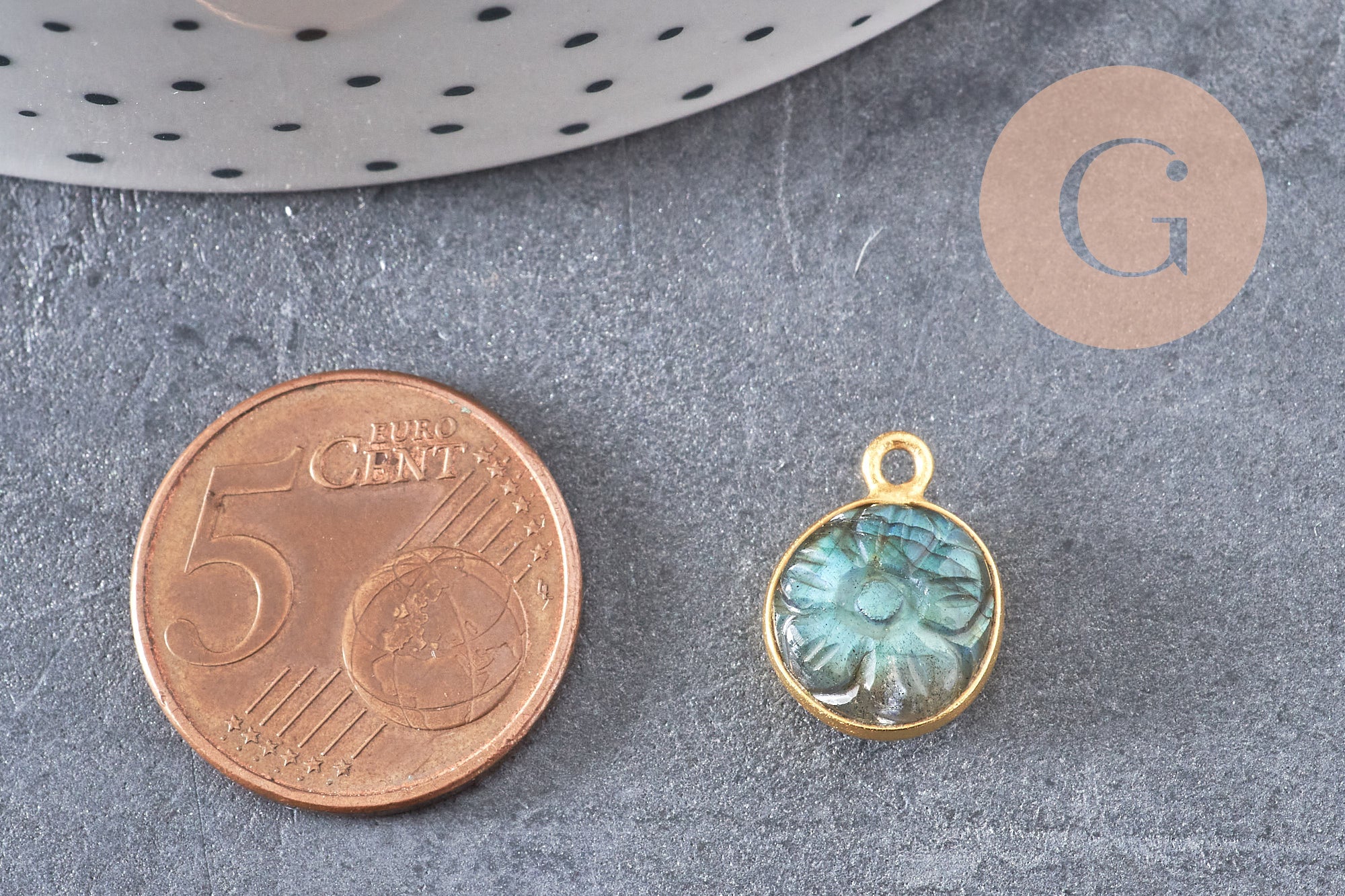 Add a mystical and precious touch to your creations with this round flower pendant in carved natural labradorite , set on a 925 sterling silver mount plated with 18K gold .