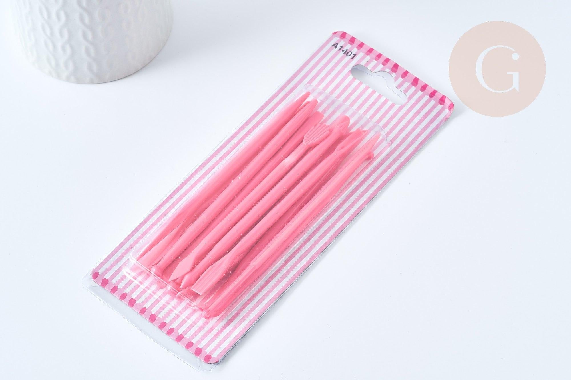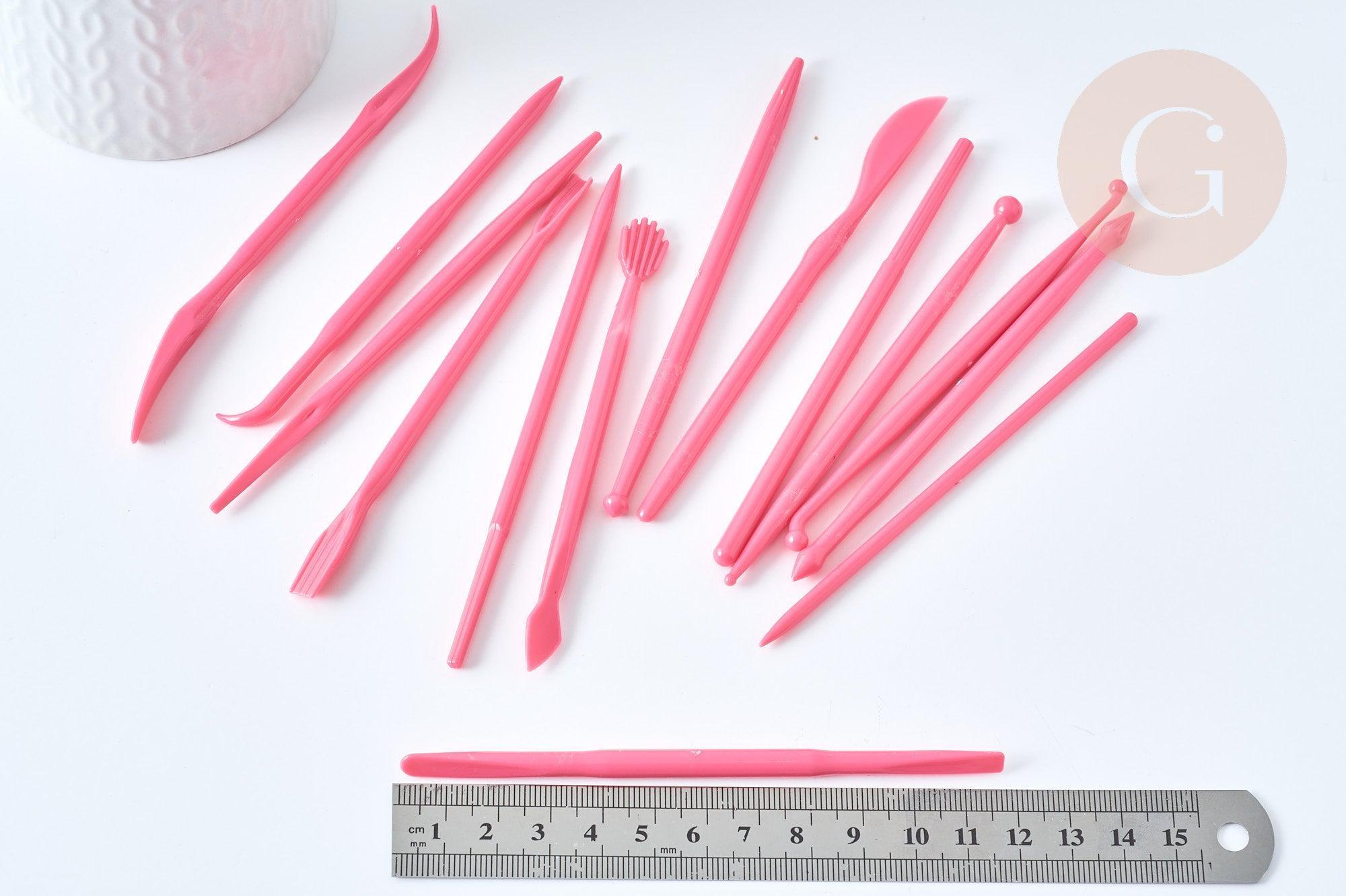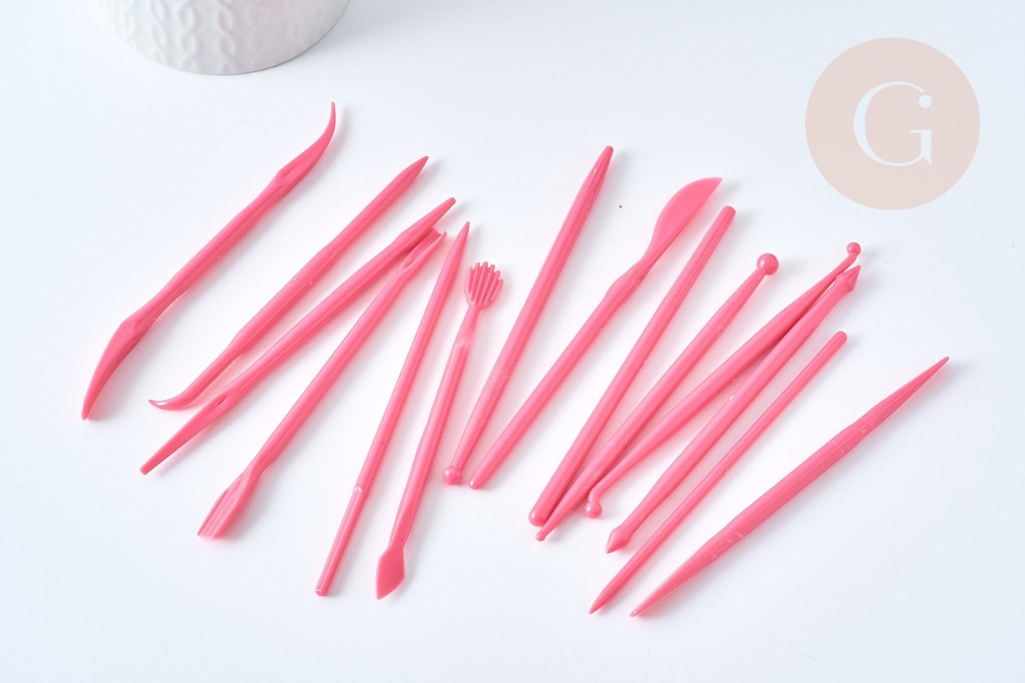 This set of 14 pink plastic tools is perfect for all your polymer clay, clay, self-hardening clay, or ceramic creations. Lightweight and handy, it offers a comfortable grip and a wide variety of shapes for sculpting, smoothing, cutting, or texturizing with precision.