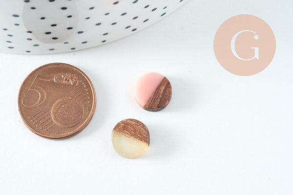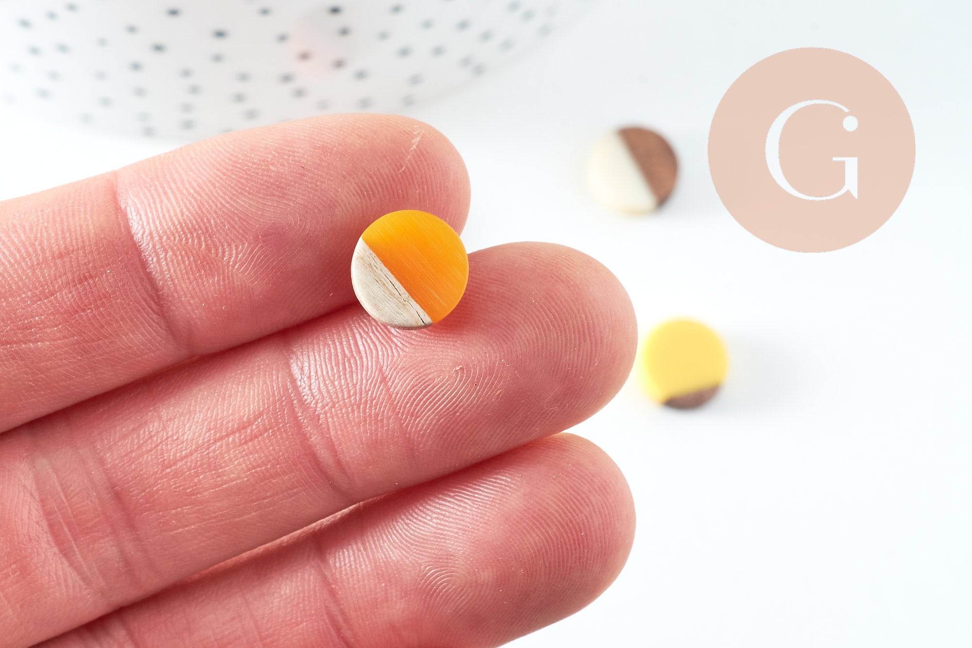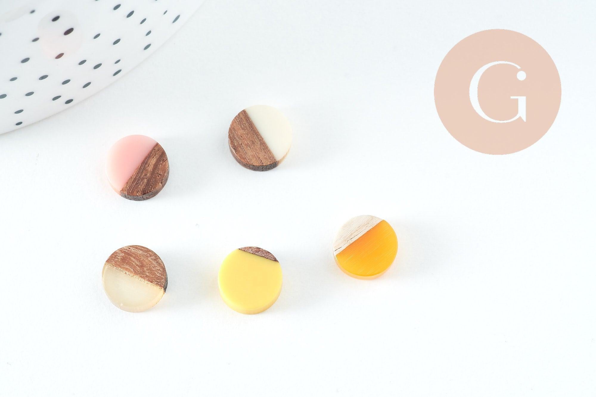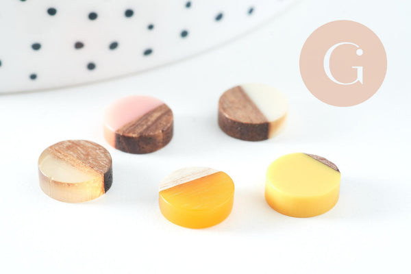 Very simple-looking disc-shaped beads, made of wood and resin in mixed colors, which can make very pretty pendants or complete earrings in a geometric style.