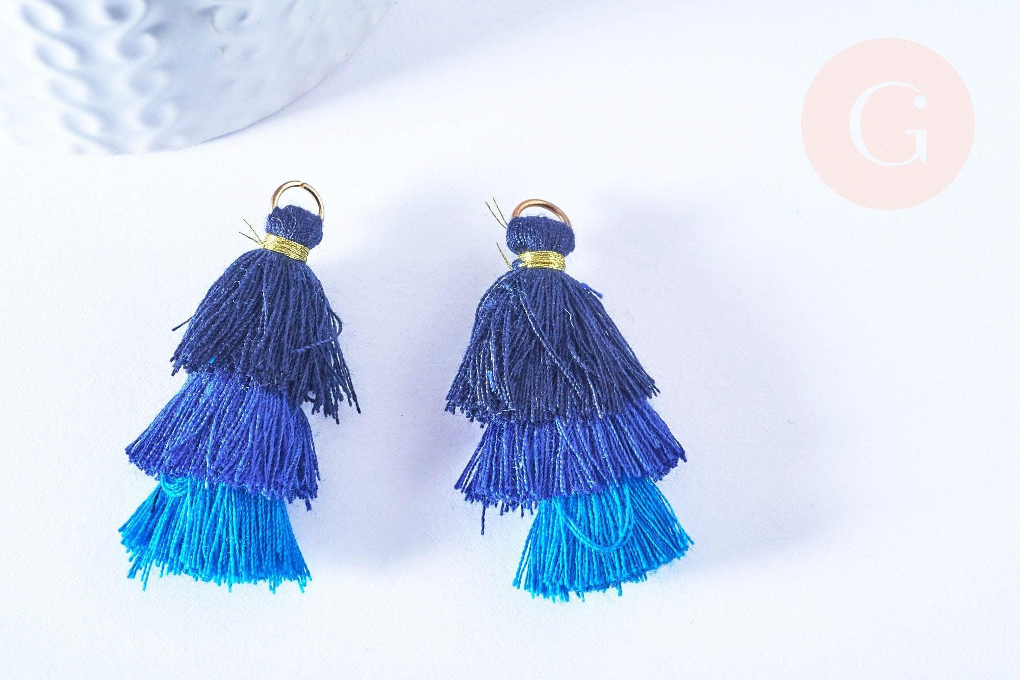 Pompon tricolore camaieu bleu coton 43mm, décoration pompon, triple pompon, boucles pompon, x1 (G2127)