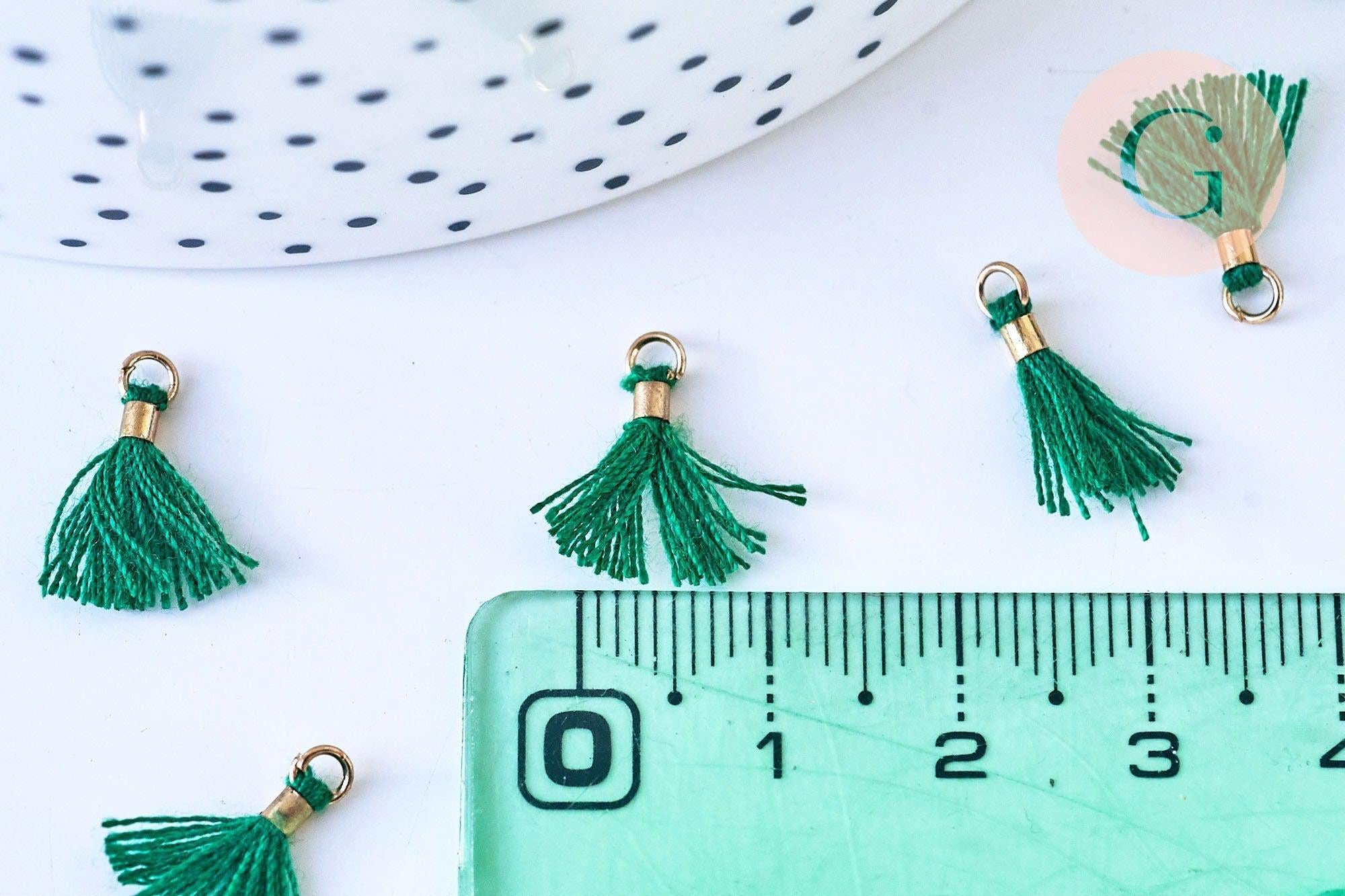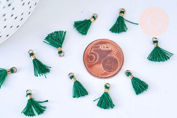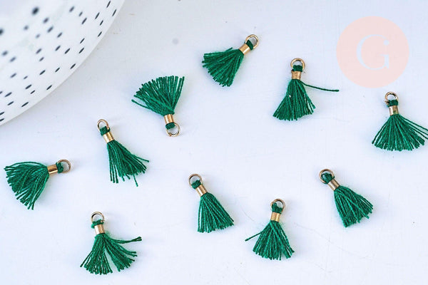 Emerald green polyester pompom with gold backing, pompom decoration, pompom loops, bohemian jewelry making, 10-15mm, x10 (G5563)
