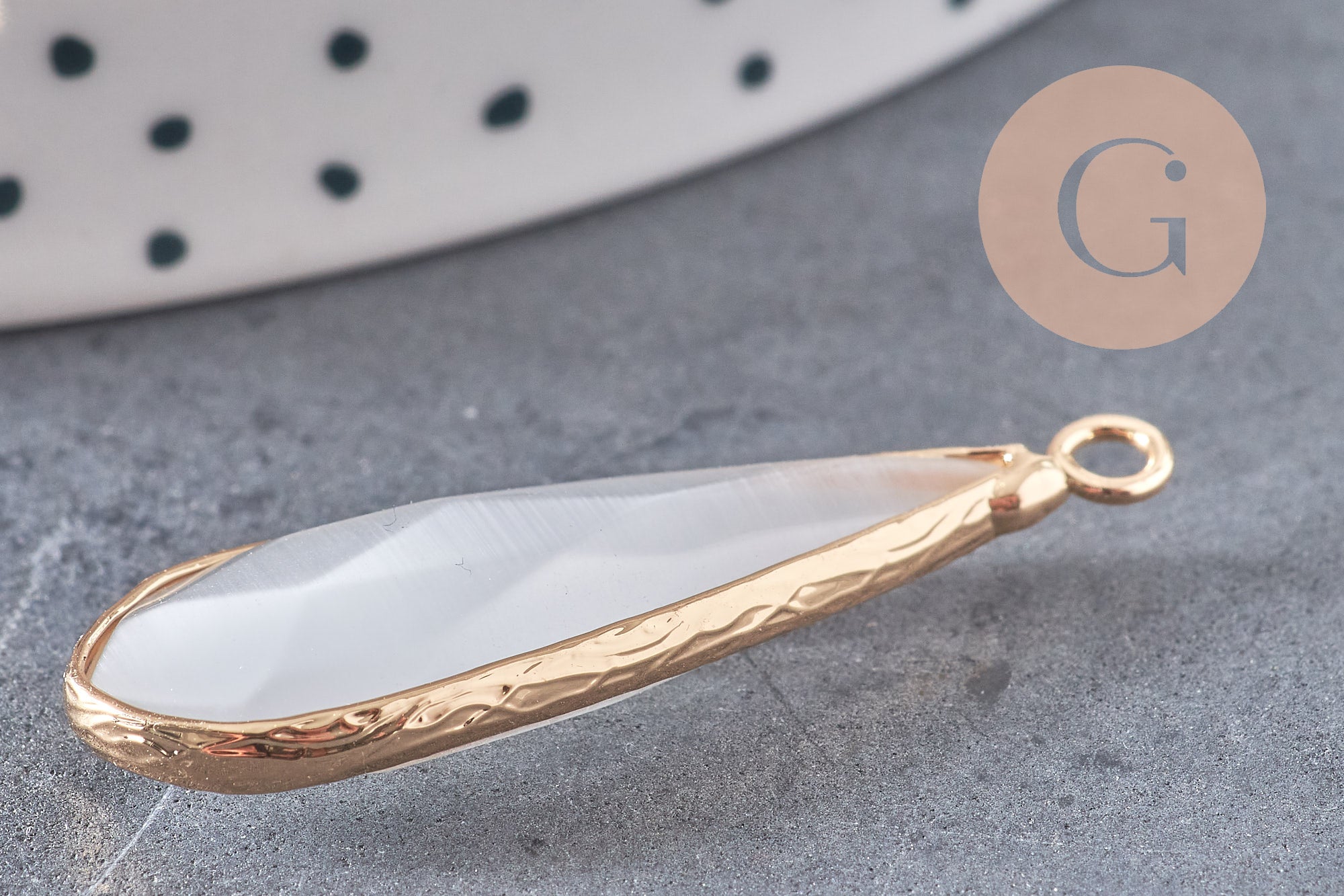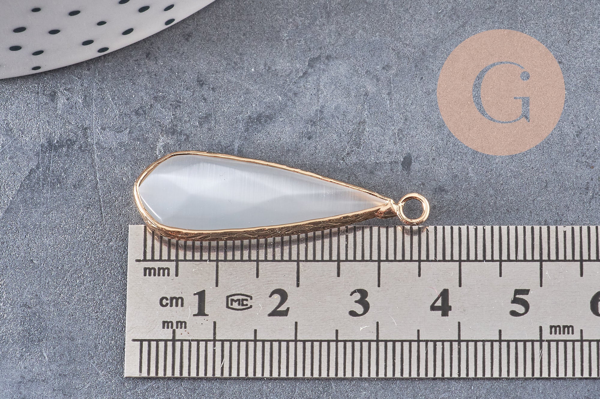 White glass drop pendant faceted gold, craft supplies, stone pendant, cat's eye glass, 31mm, x1 G5192