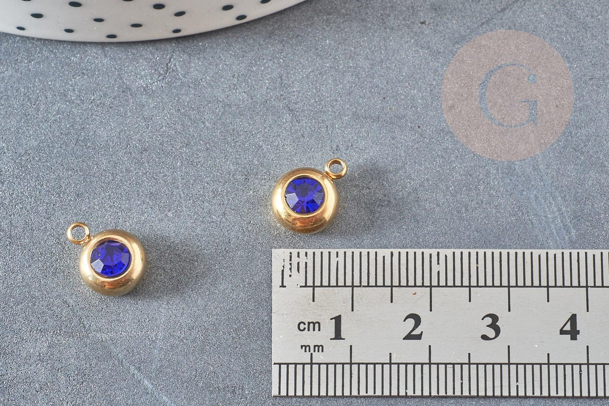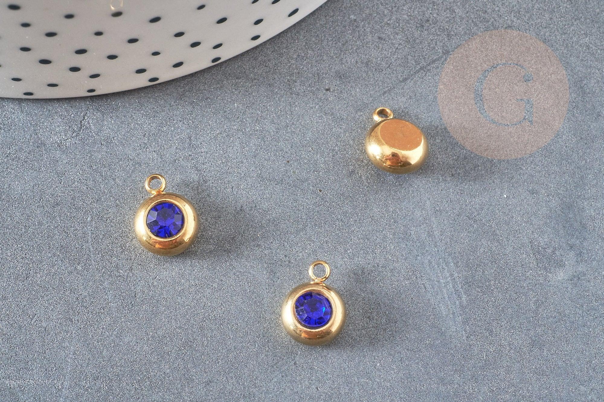 Round pendant in 24 carat gold-plated steel with blue crystal, crystal pendant, gold-plated crystal pendant, jewelry creation, 12mm, unit