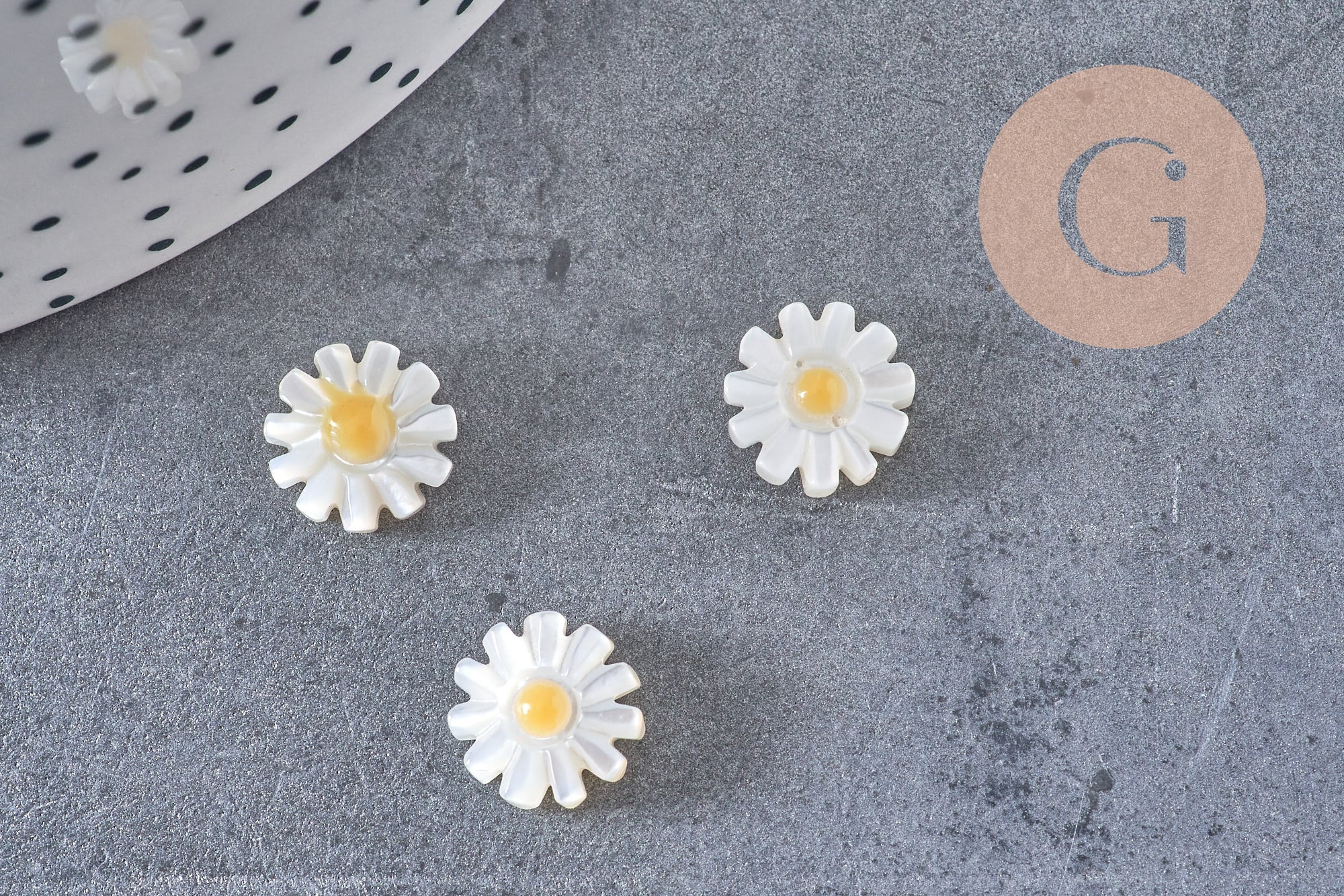 Fall for these daisy flower beads in white and yellow natural mother-of-pearl. A nice product for making fine and elegant earrings and necklaces.
