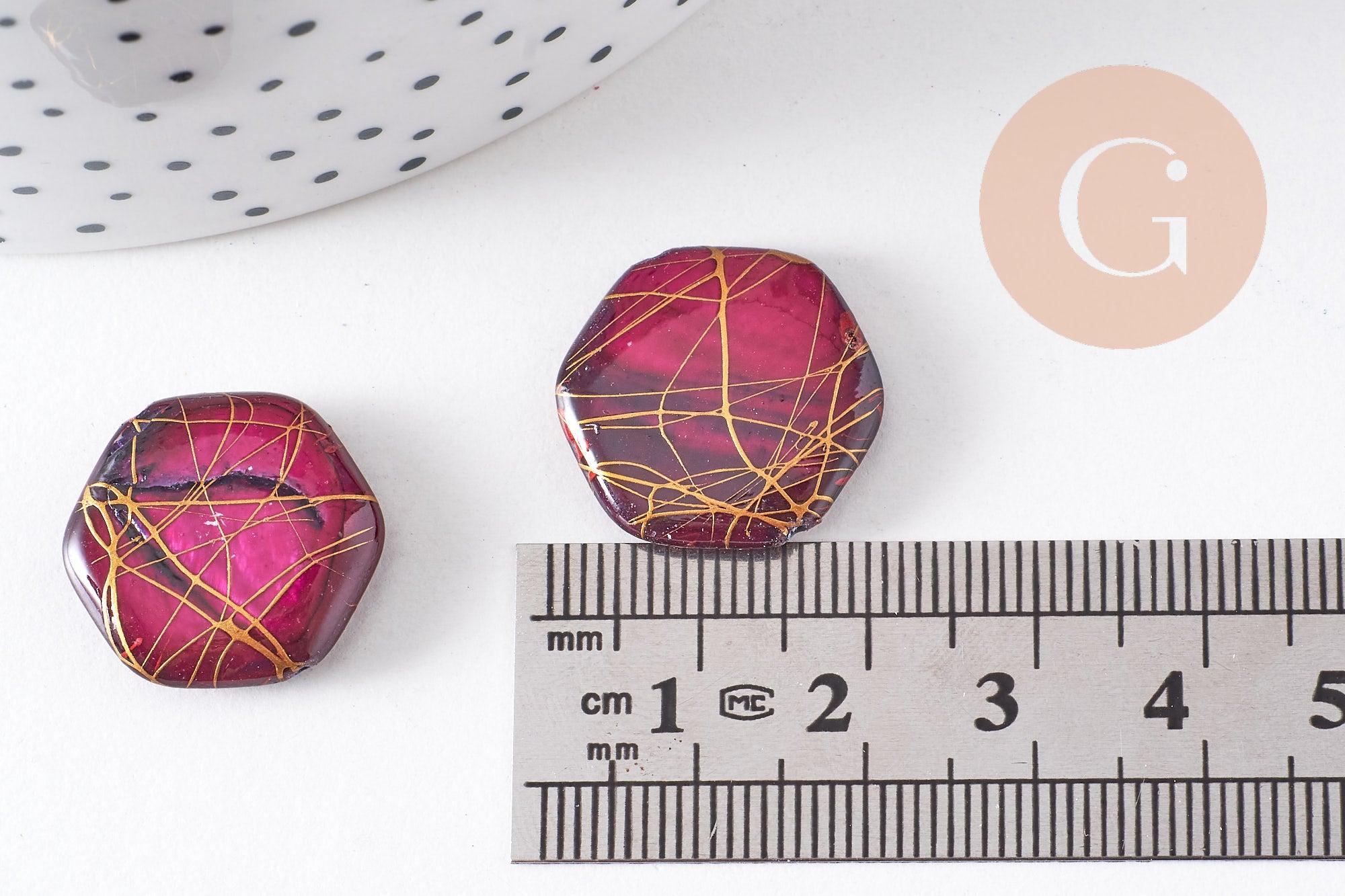 Fall for these hexagonal beads in natural mother-of-pearl tinted in fuchsia pink and decorated with gold thread.