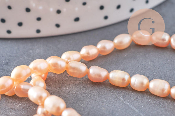 Natural freshwater pearls in orange-peach color, sold by strand.
