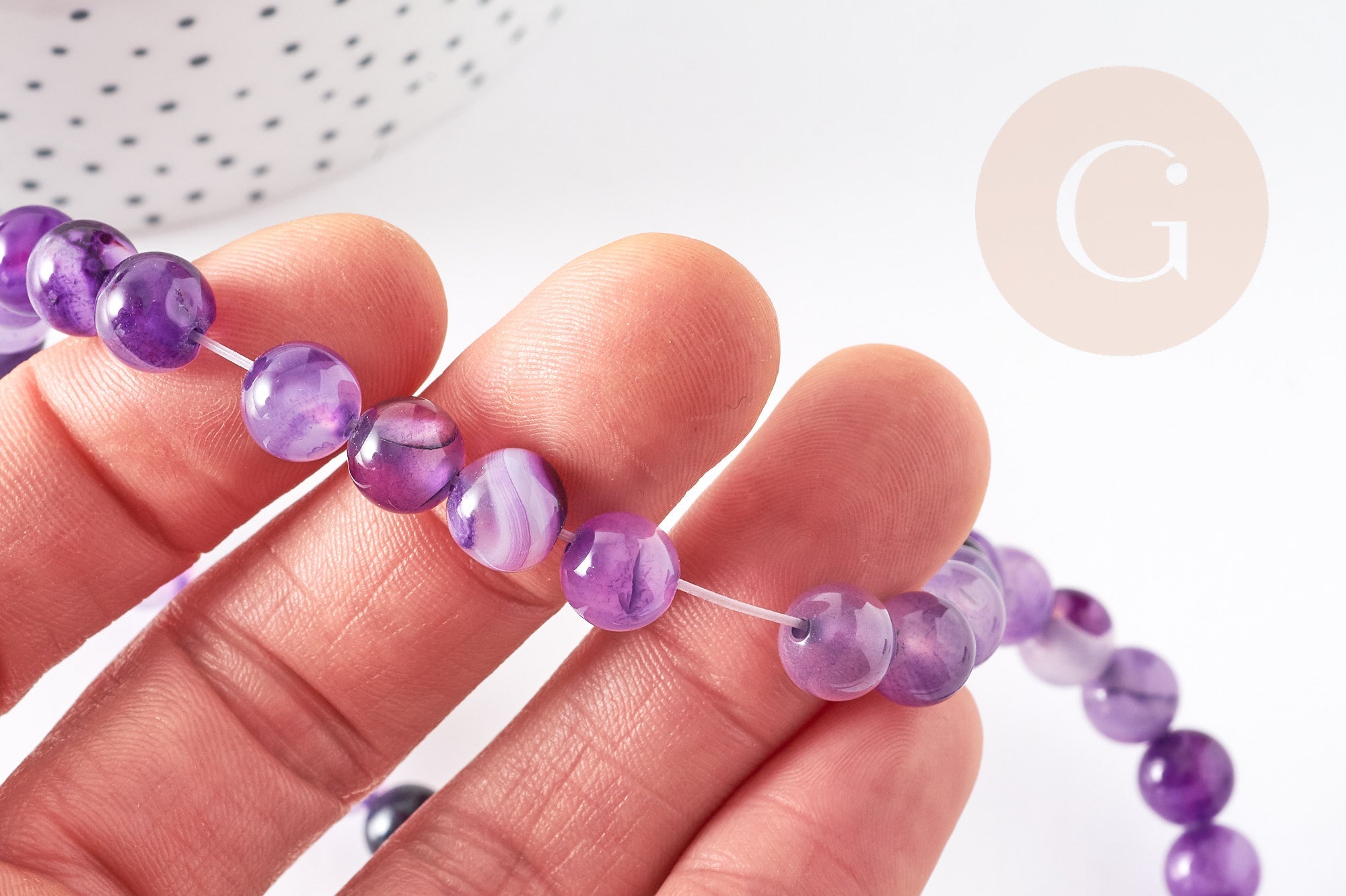 A thread of approximately 45 round purple-tinted agate beads to make colorful stone jewelry.