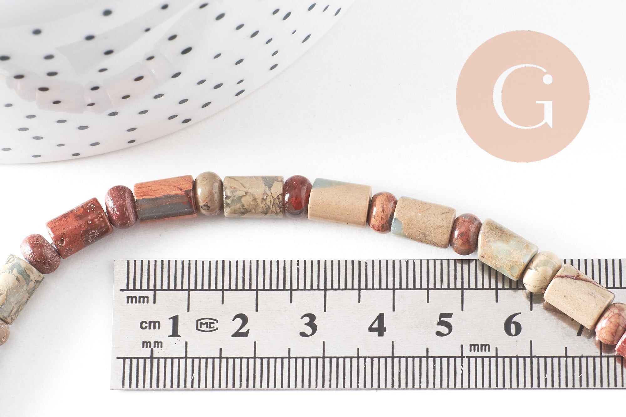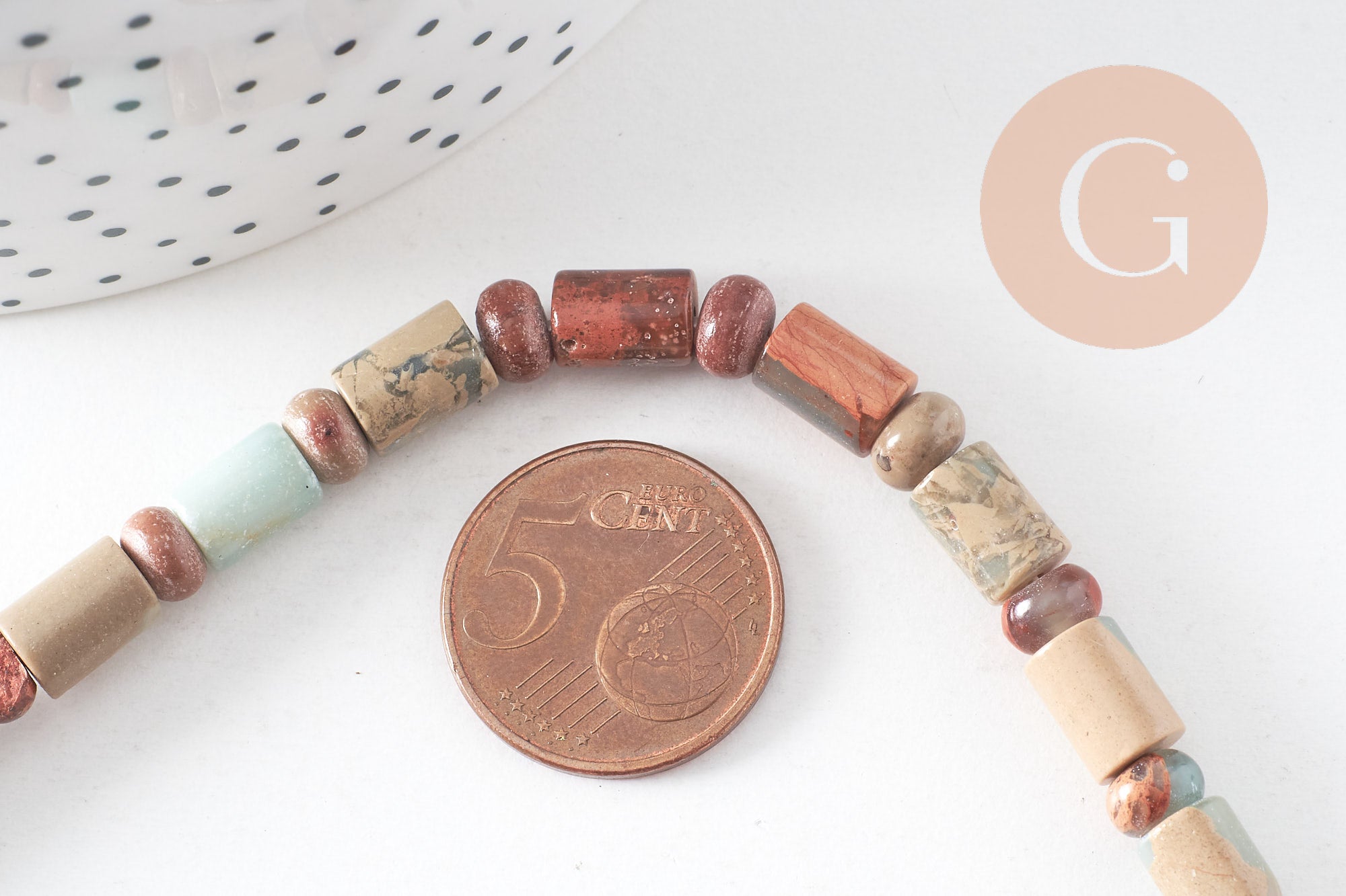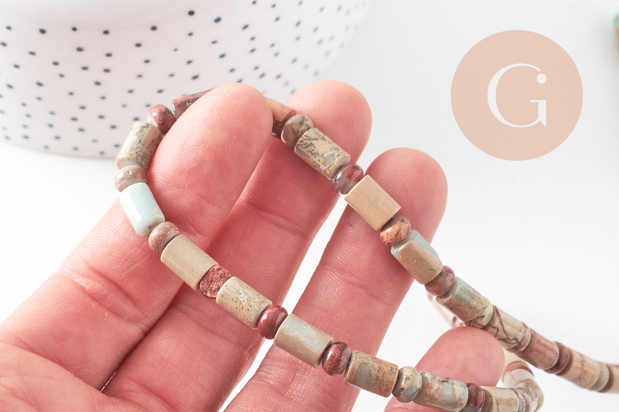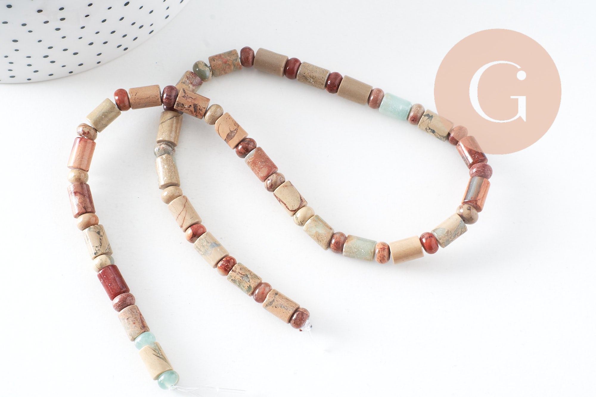 A strand of tube and heishi beads in aquaterra jasper, in shades of turquoise and brown. They are magnificent for making natural stone bracelets.