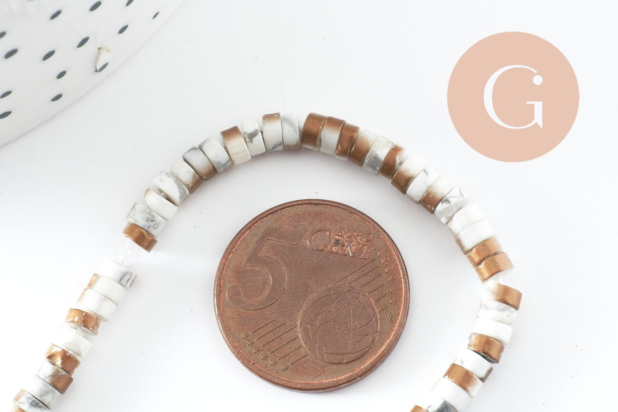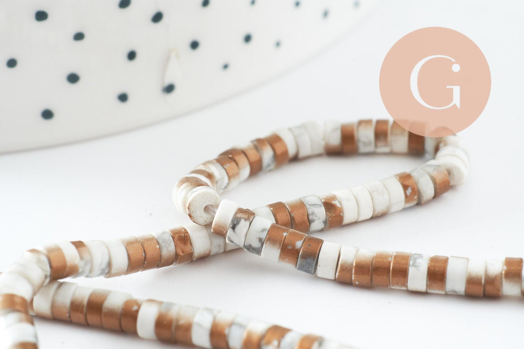 Bring an ethnic chic touch to your creations with these natural white howlite heishi round beads subtly tinged with gold. Their marbled effect and irregular gold finish add character to your jewelry while maintaining a natural elegance.