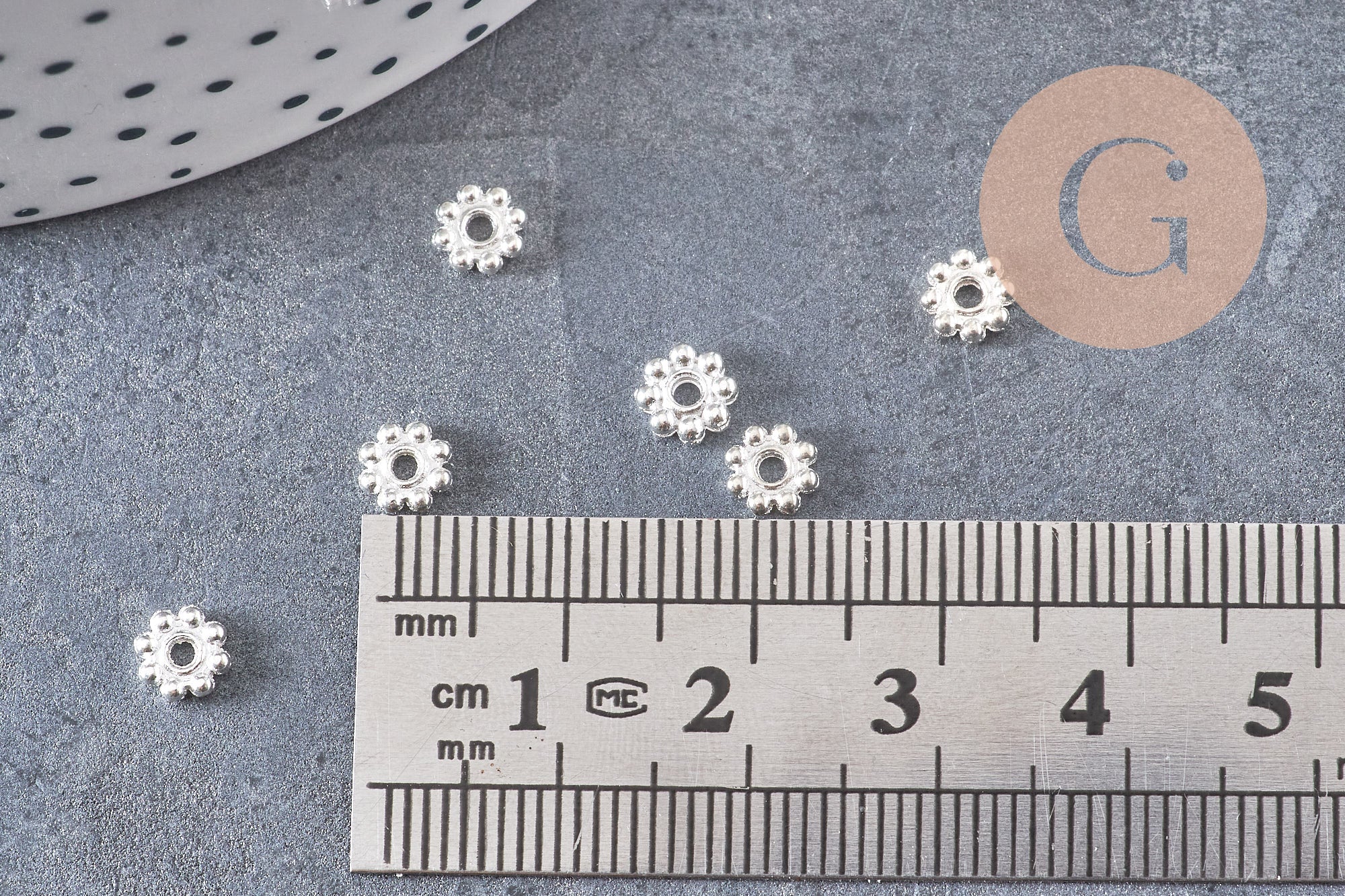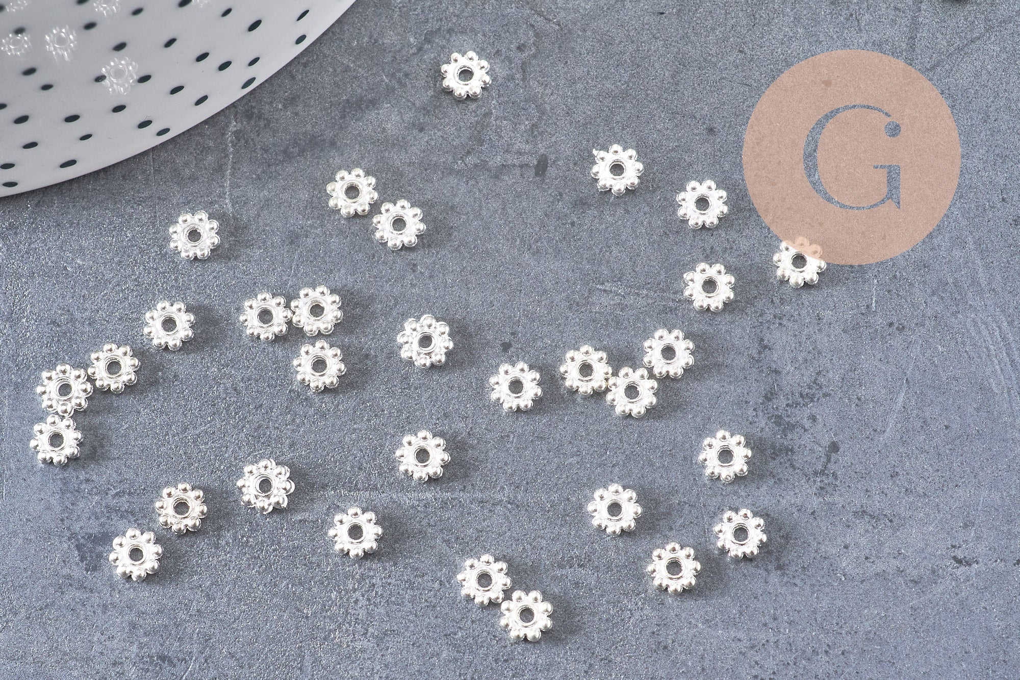 Silver-plated brass flower discs, silver beads, jewelry making, spacer beads, 5mm, x10 (G0946)