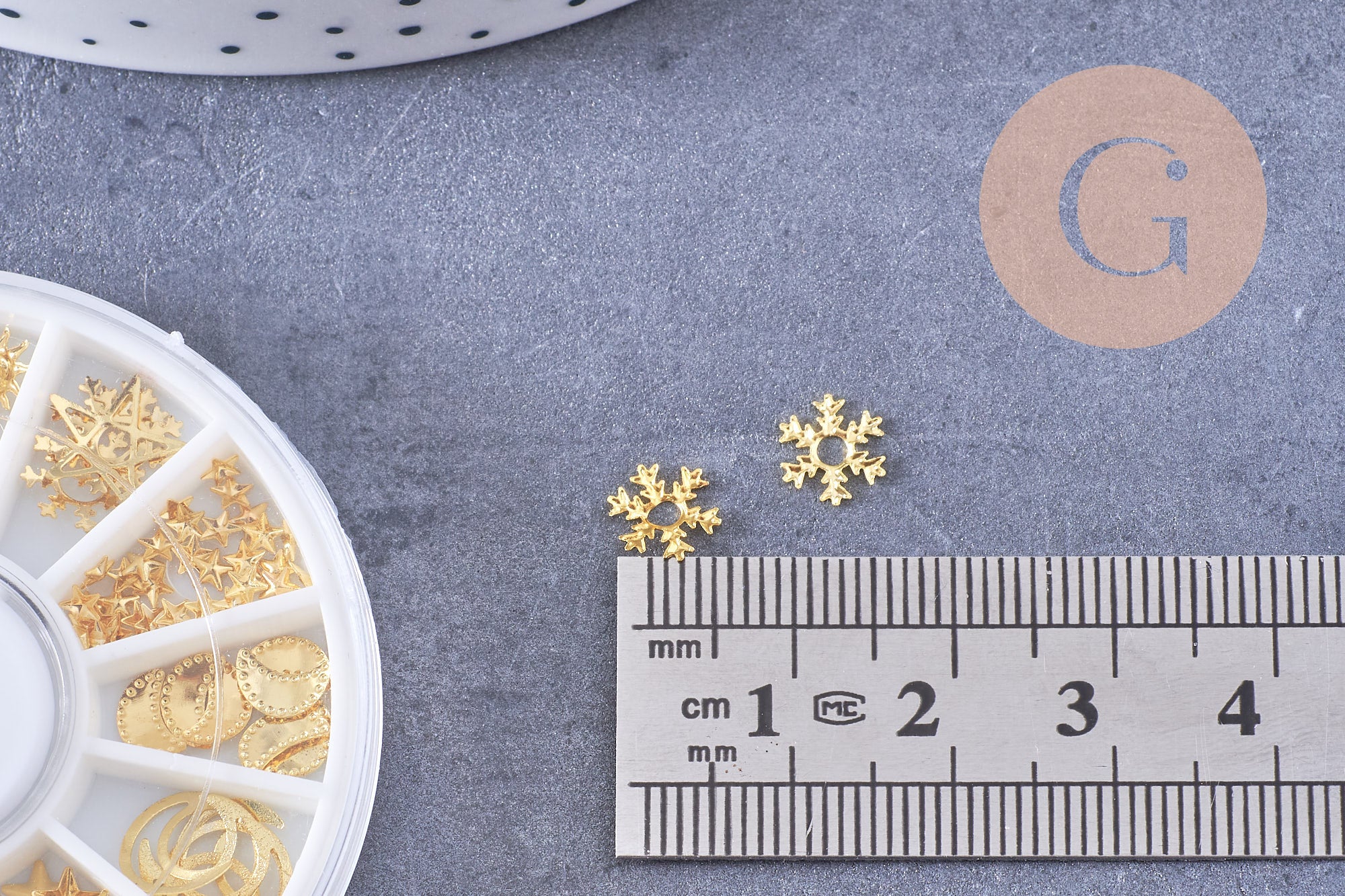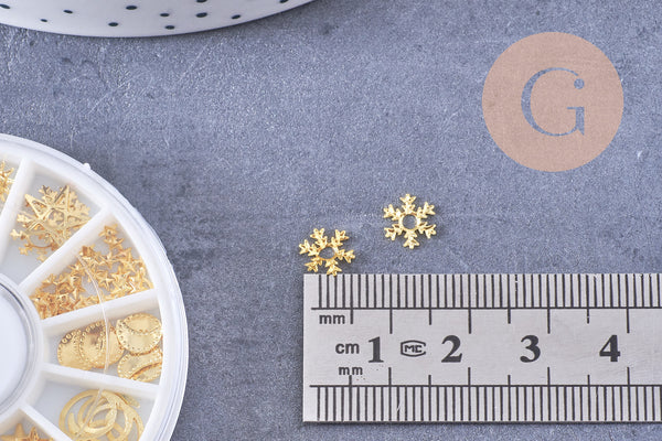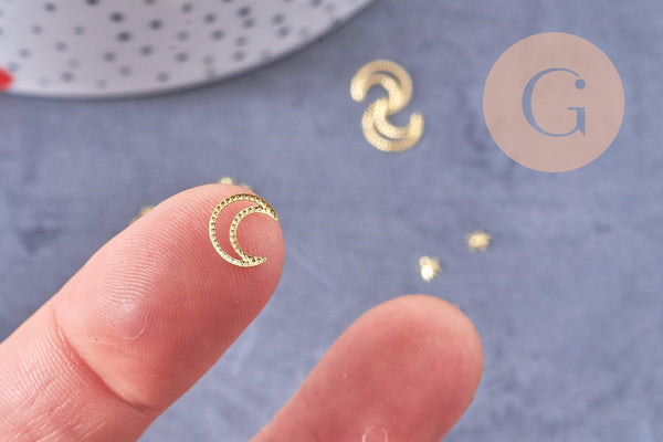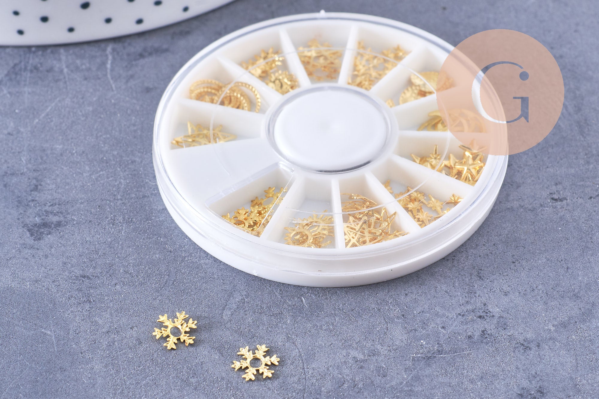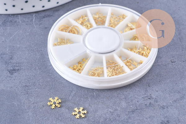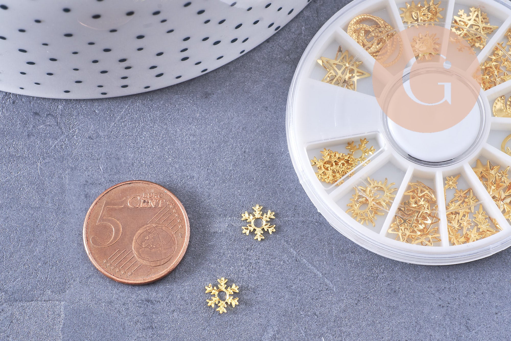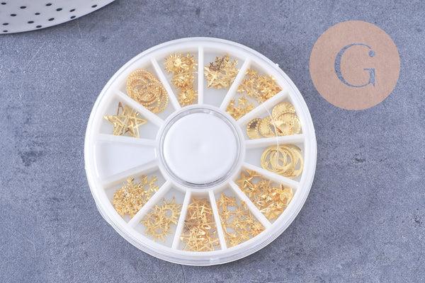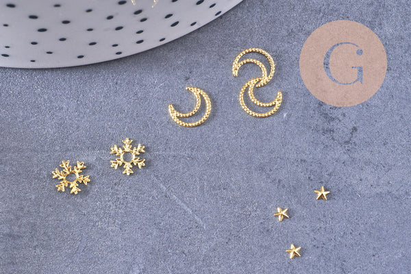 Create personalized and poetic jewelry with this box of 200 mini charms to stick in gold zamac , representing celestial symbols : sun, moon, star and snowflake. Little wonders to integrate into your DIY creations for a refined and symbolic effect.