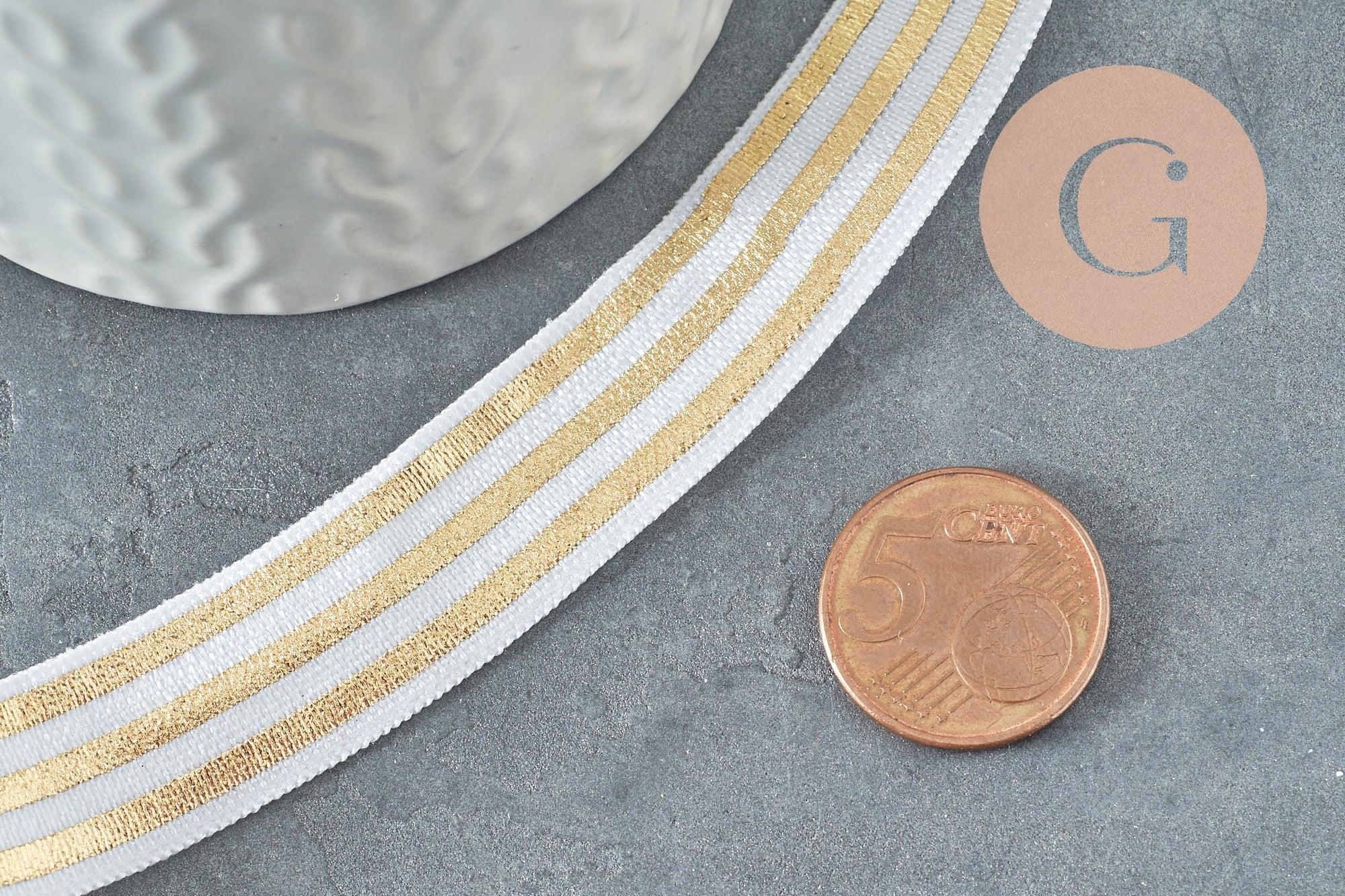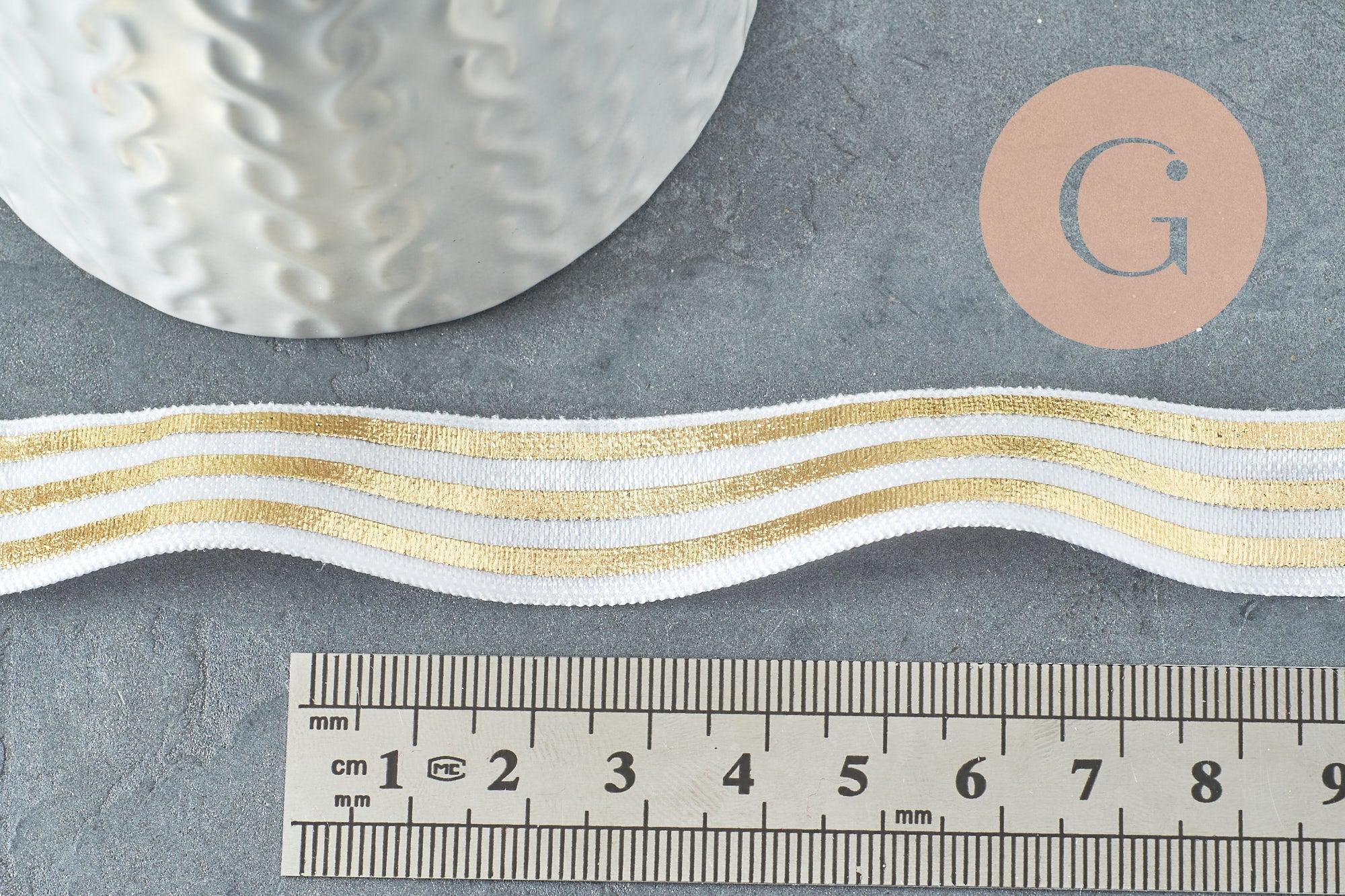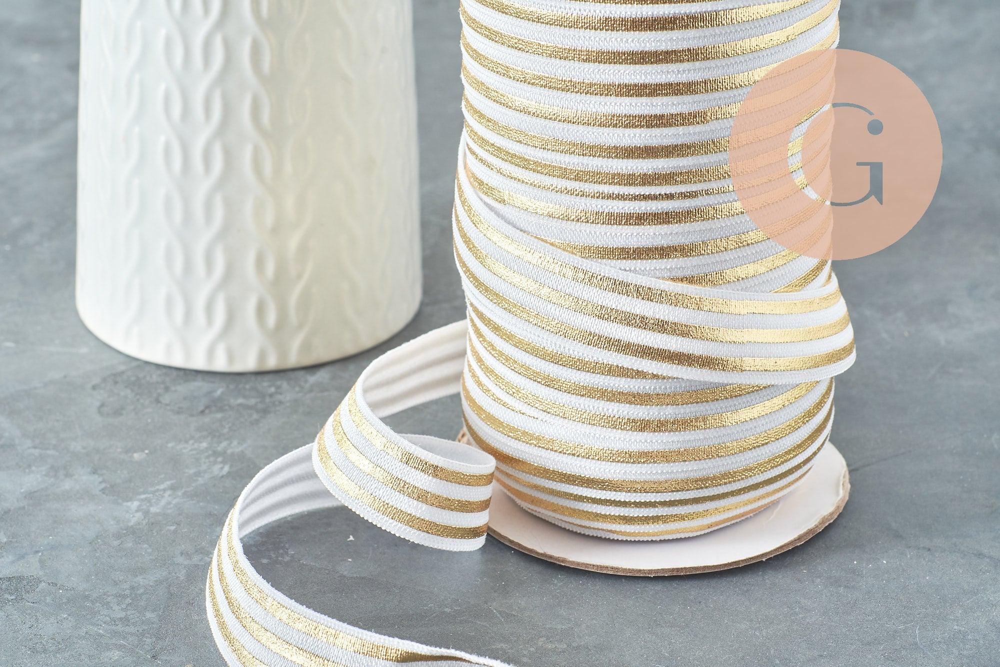 You will love this wide elastic ribbon with its golden pattern on a white background.