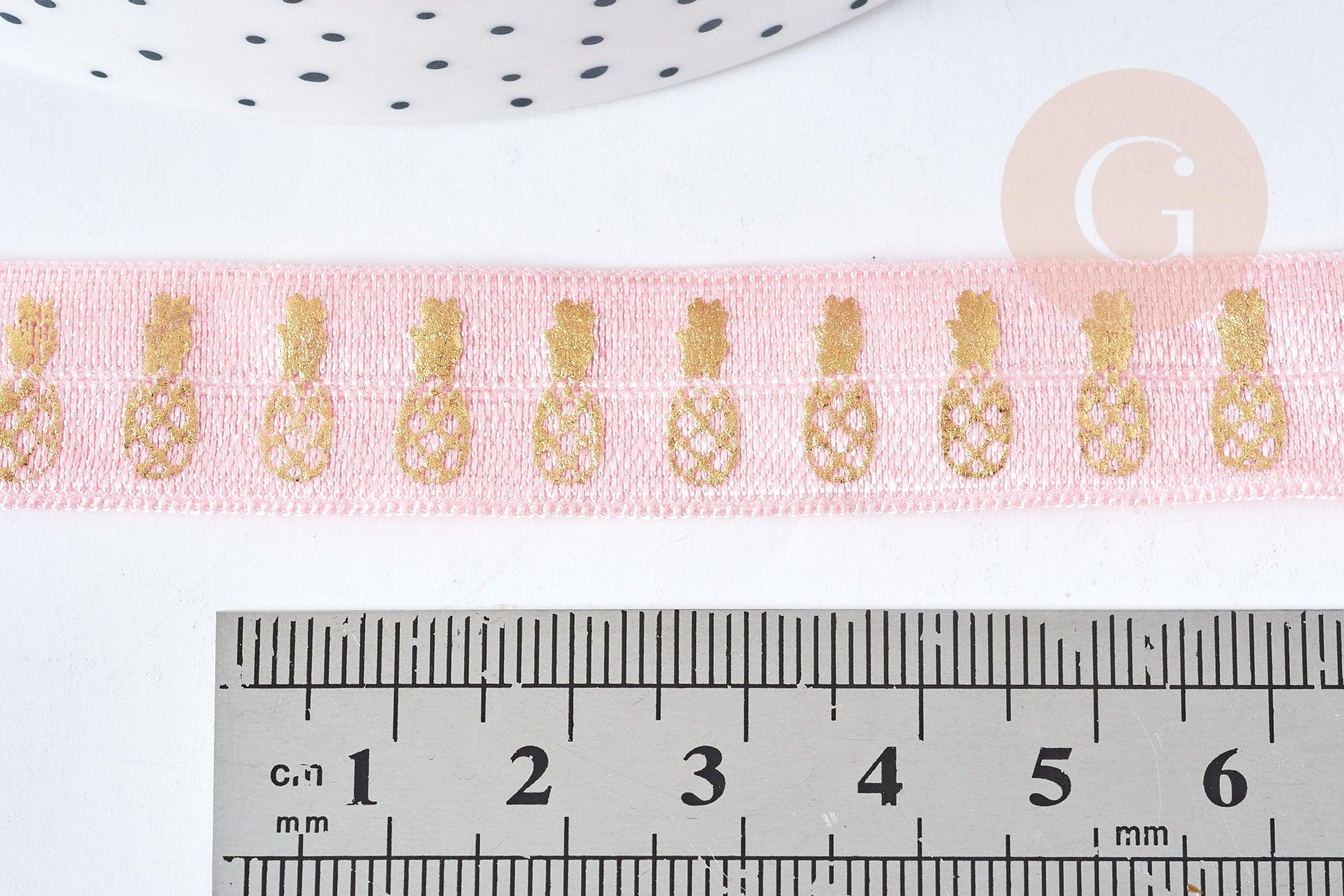 You will love this wide elastic ribbon with its gold PINEAPPLE pattern on a pink background.