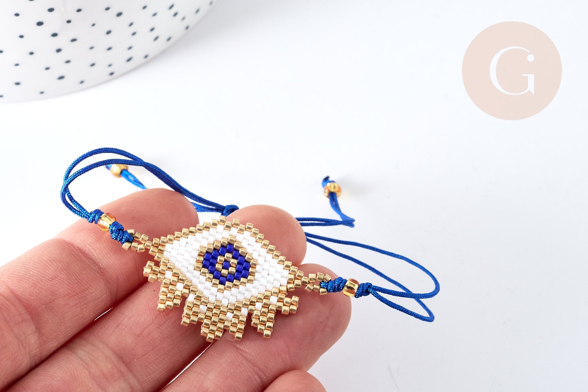 The blue nylon bracelet adorned with a weave representing a protective eye , made from black and gold seed beads, creating a magnificent costume piece of jewelry.