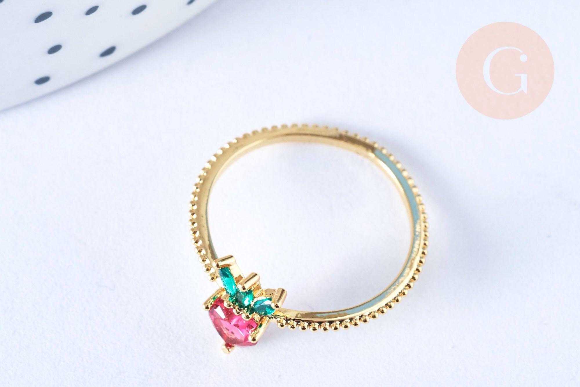 Fall for this adorable strawberry-shaped ring , encrusted with red and green zircons. Mounted on a 16K gold-plated brass band, this fancy ring is a concentrate of sweetness and pep, perfect for sunny days or to offer as an original gift.