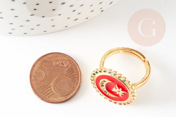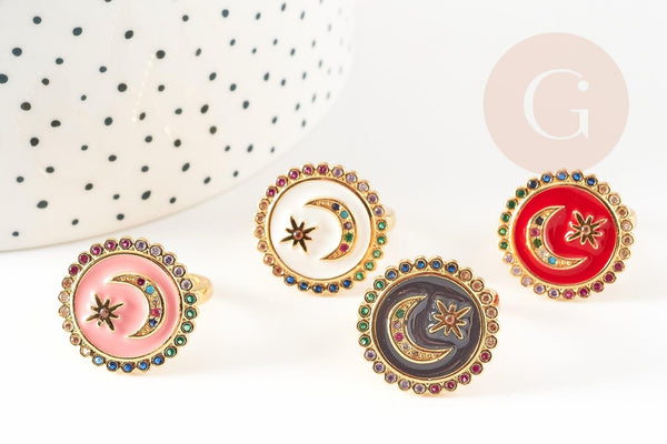 Adjustable ring in gold-plated brass with enamelled moon, jewelry creation, women's ring, birthday gift, 17mm, unit