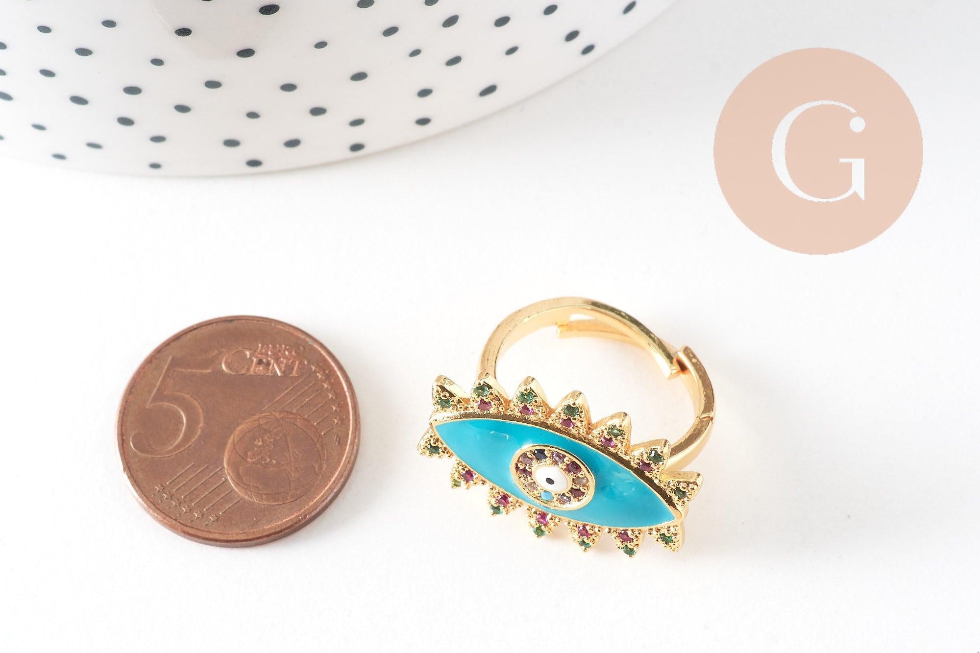Adjustable ring in gold-plated brass with protective eye enamel, jewelry creation, women's ring, birthday gift, 17mm, unit