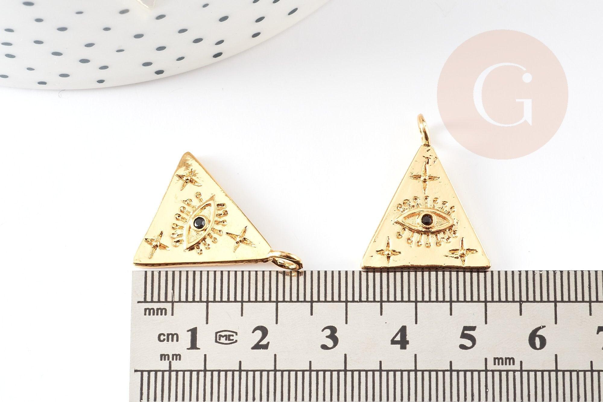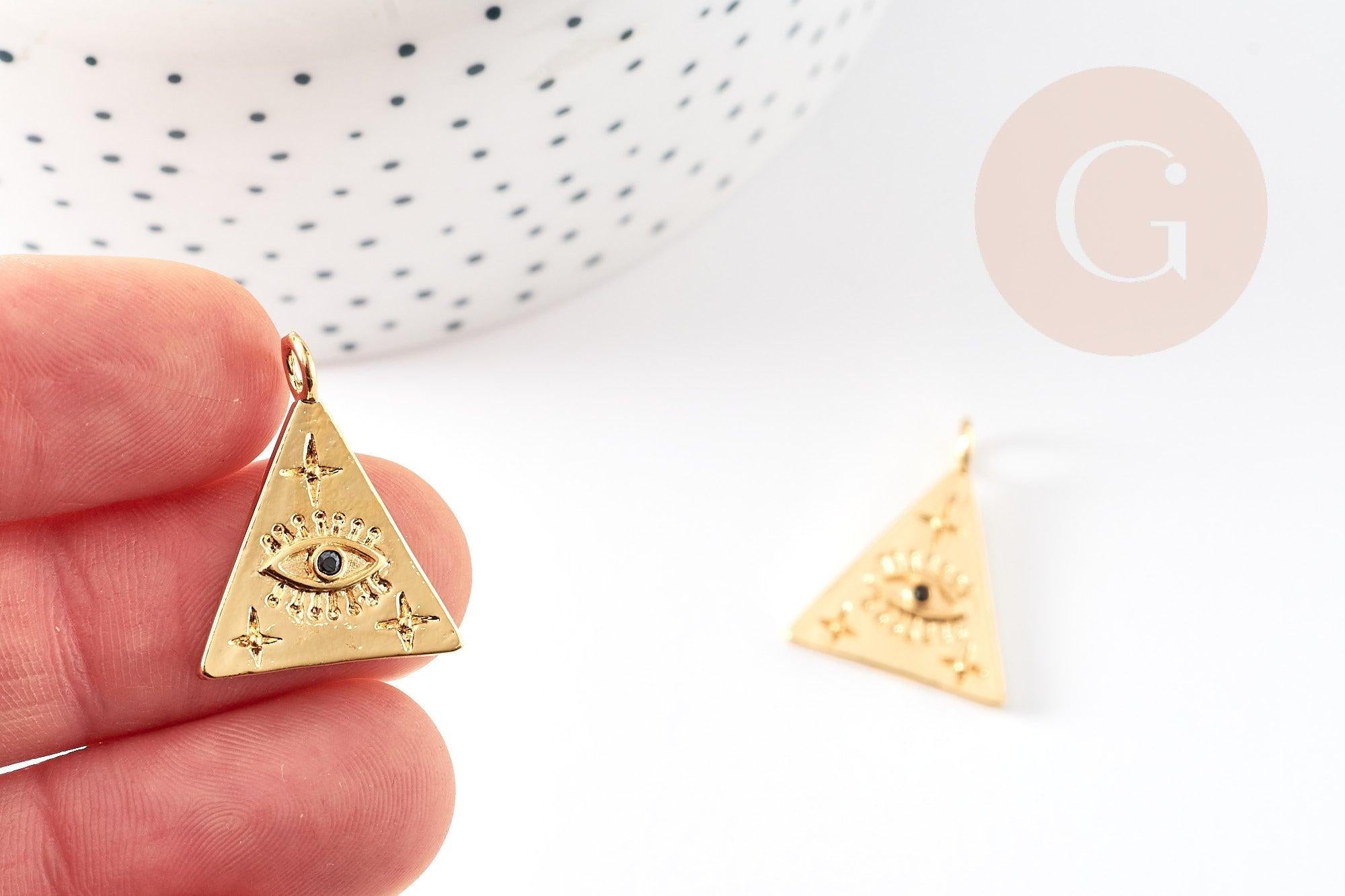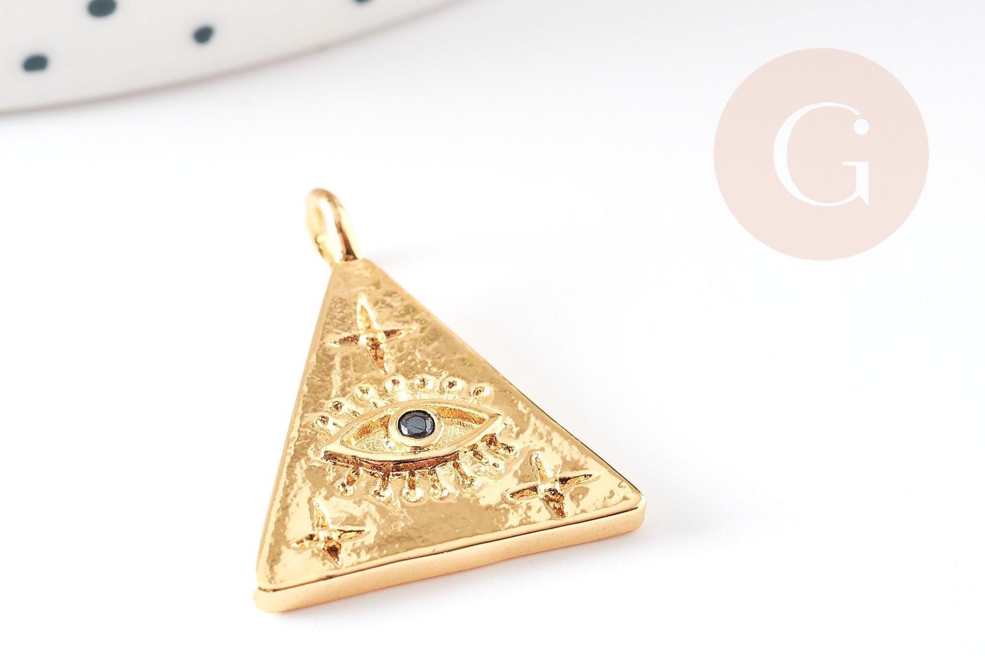 Triangle eye medal pendant in 18K gold-plated brass with textured zircon, nickel-free gold-plated pendant for jewelry creation, 23.5mm, unit