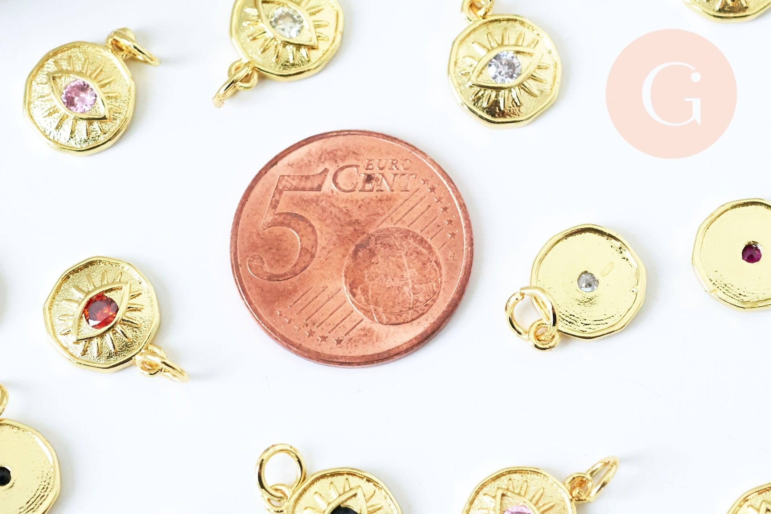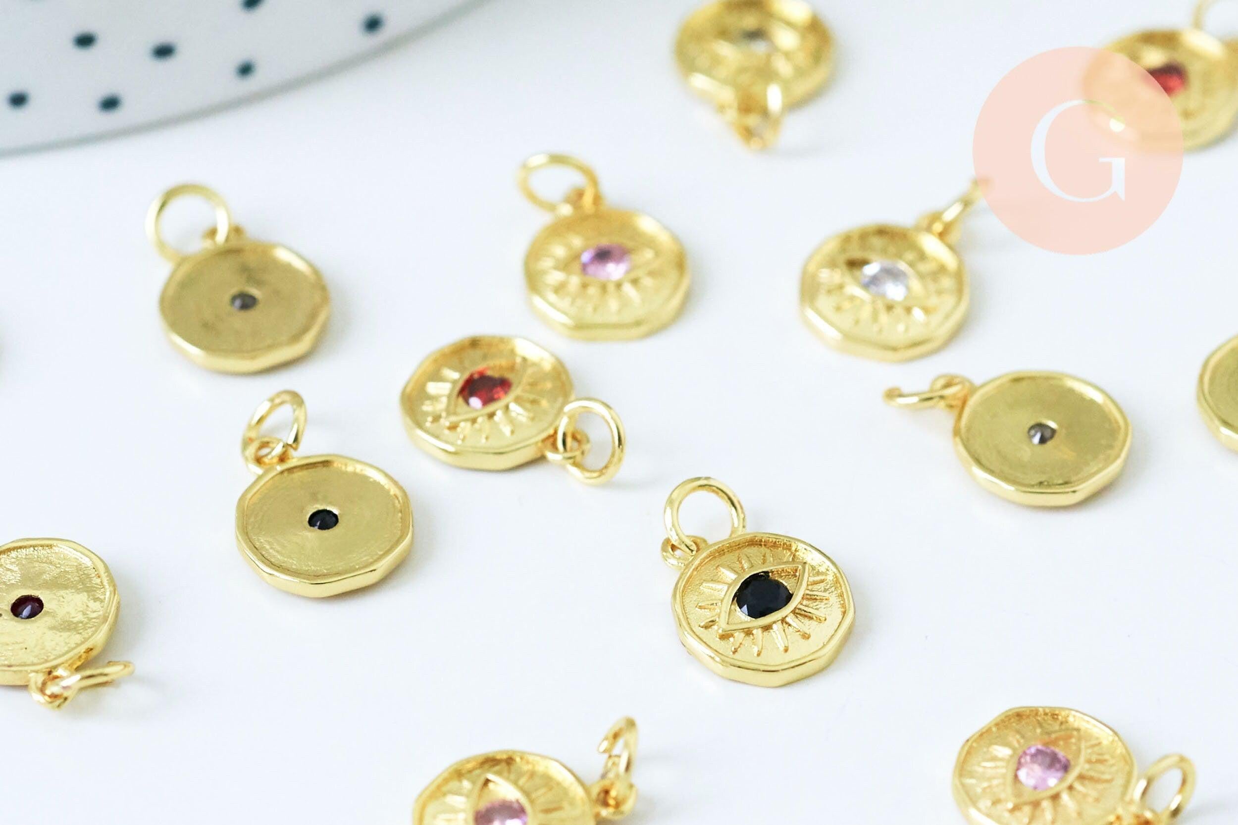 A small round eye pendant in 18K gold-plated brass and in the center a pretty white or colored zircon crystal, findings to always have in your toolbox to make all your jewelry.