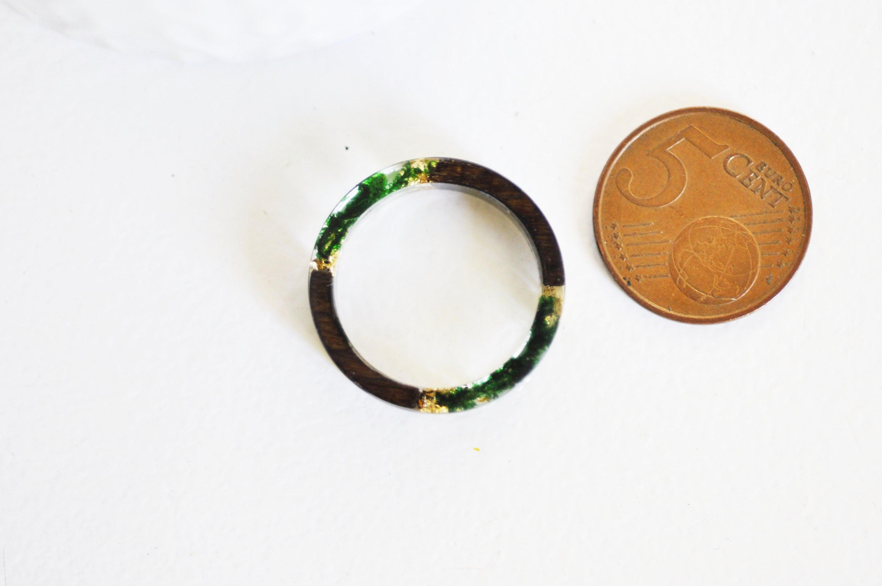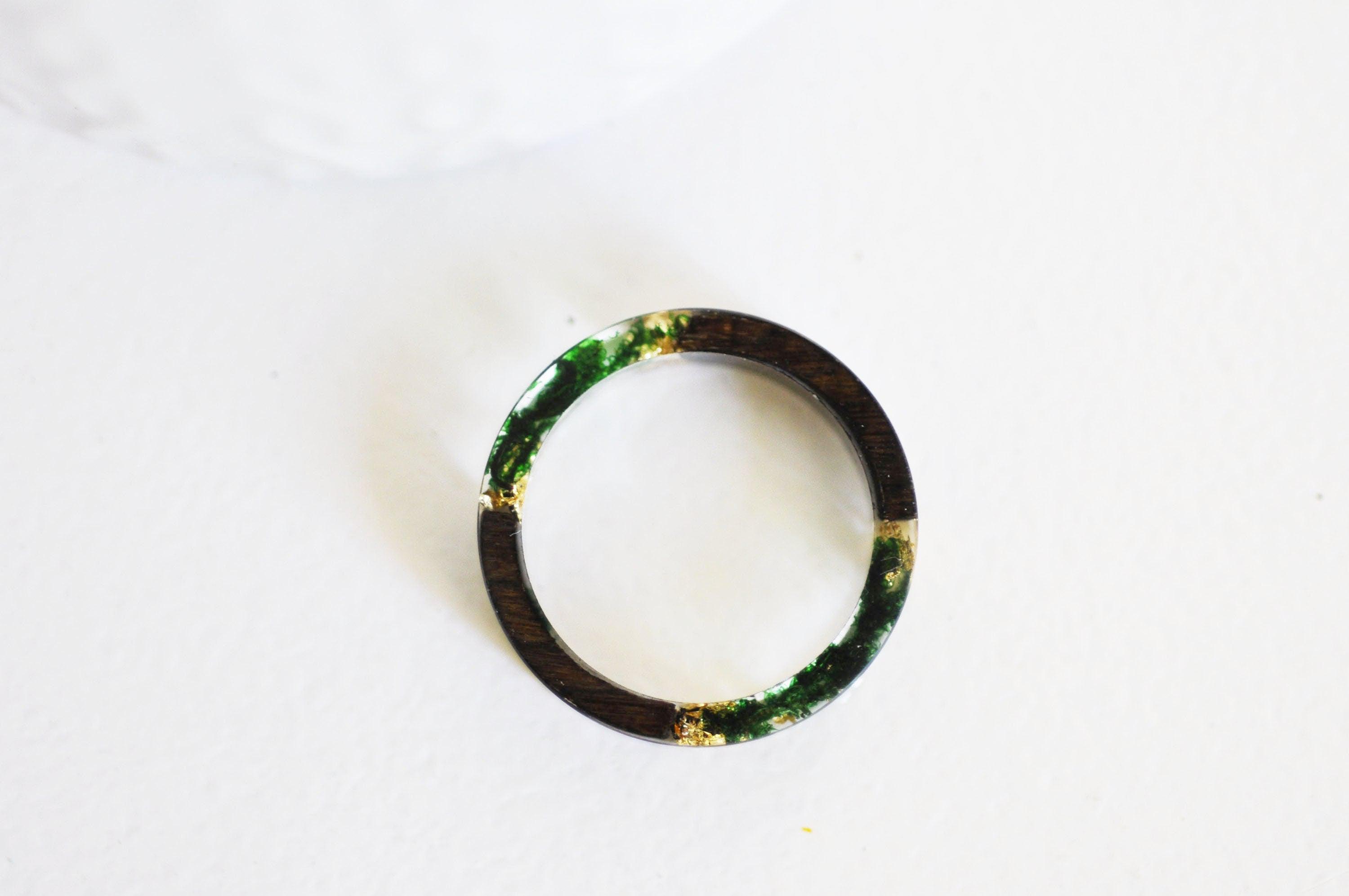 Ebony wood ring with gold leaf resin, natural wood, wooden jewelry, geometric ring, ebony wood, wooden jewelry creation, 19mm, green A splendid ring in ebony wood and transparent resin, with dried green moss and gold leaf which can be worn...