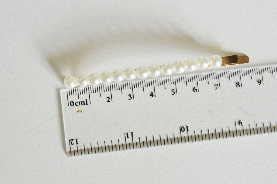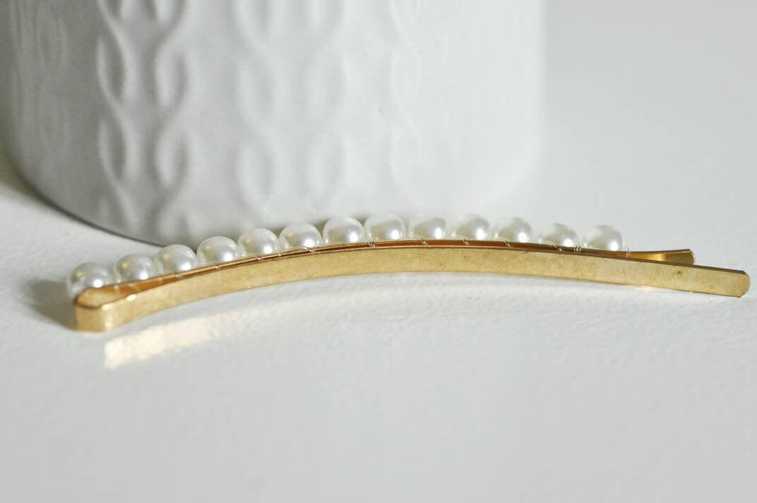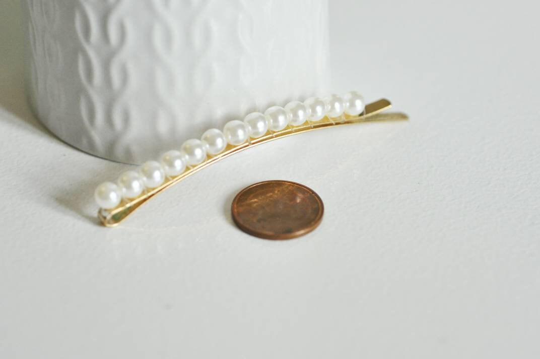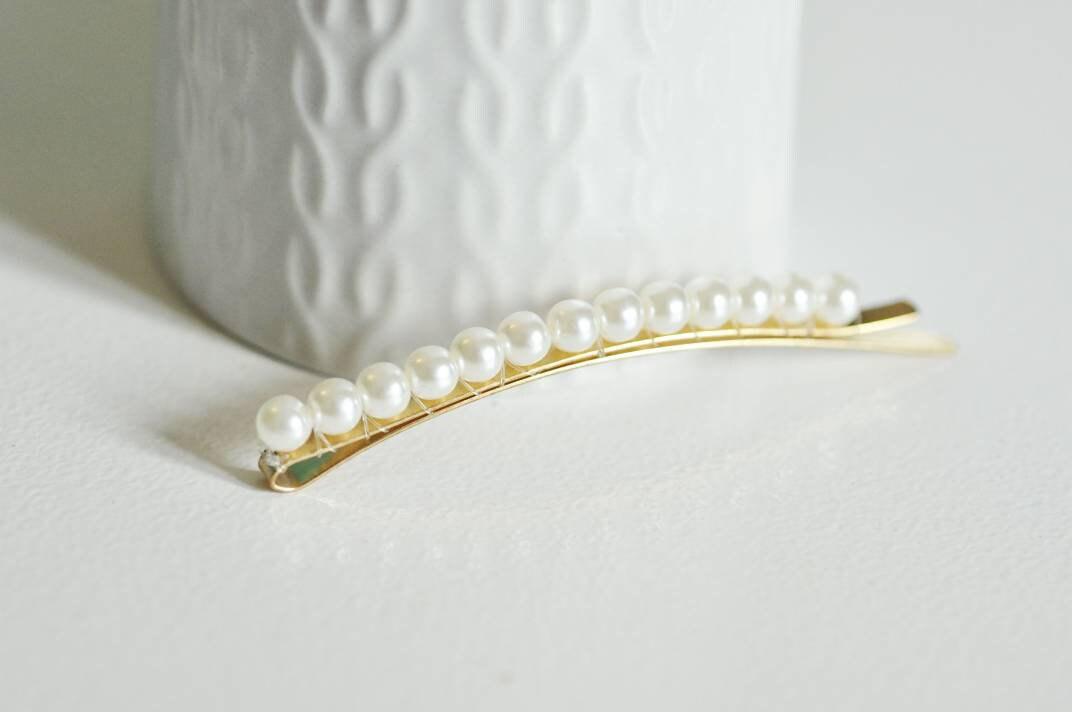 A gold metal barrette decorated with pearls (imitation) , to adopt immediately for your wedding hairstyle or to adopt for every day. Width: 15mm Length of the bar: 85mm Support diameter: 19.5mm Metal: gilded iron sold individually Other barrette holders...