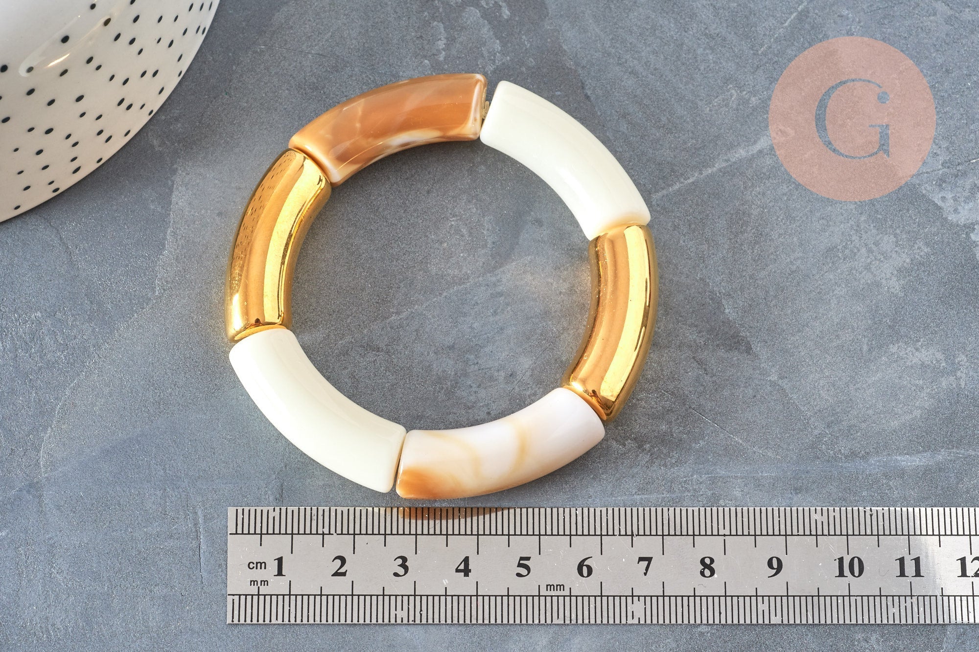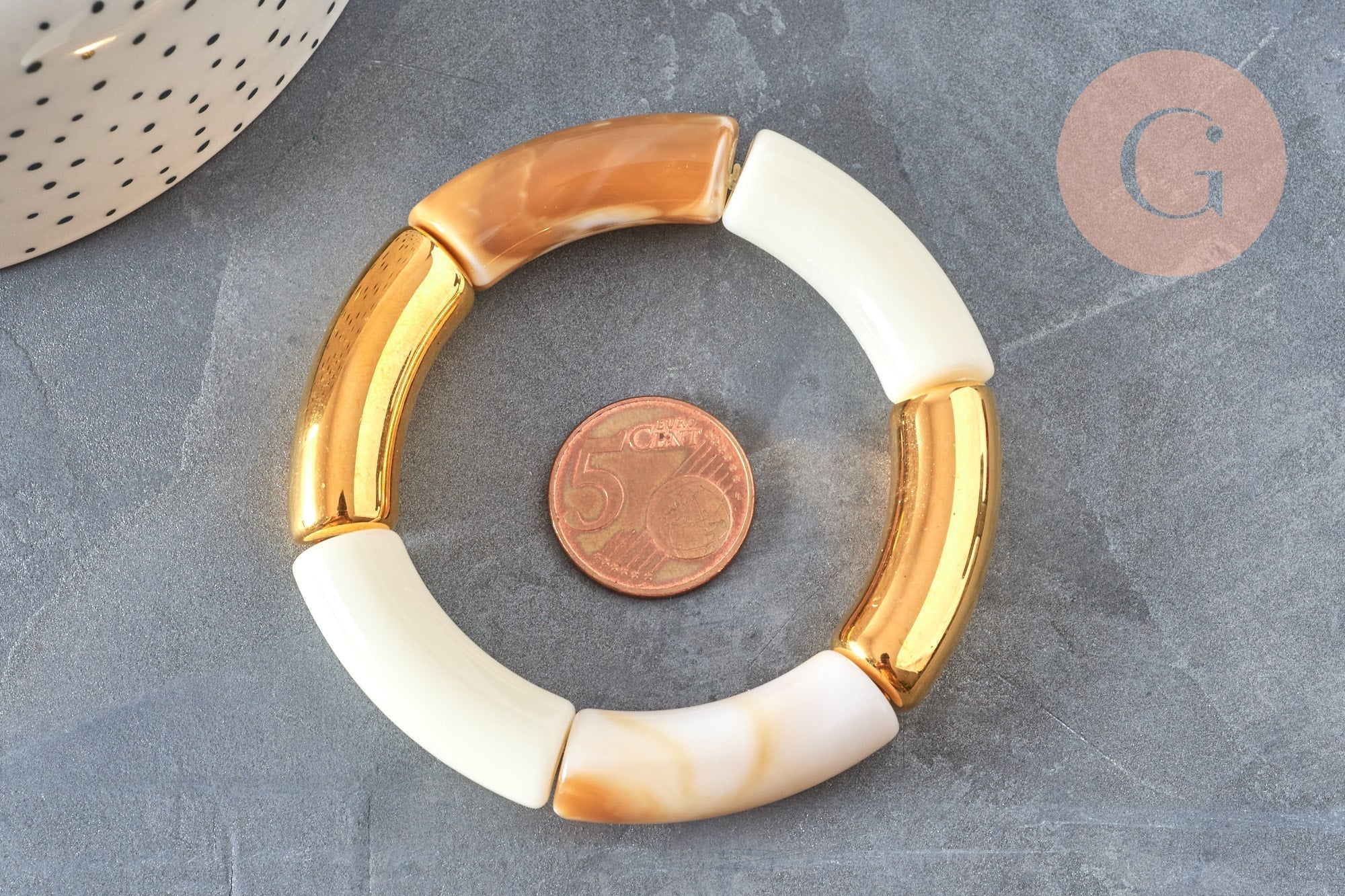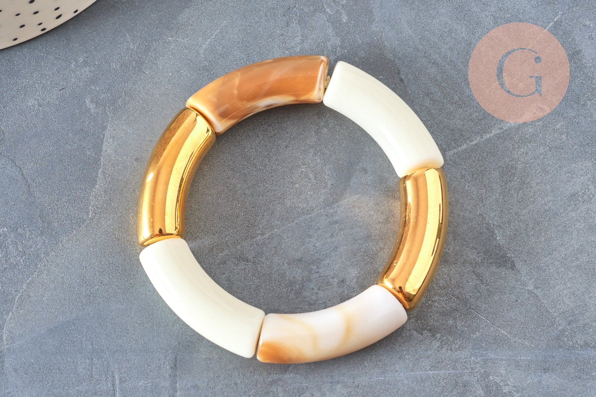 EP-Elasticated bangle bracelet in beige and gold resin with imitation stone 50mm, x1 (G6927)