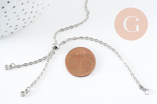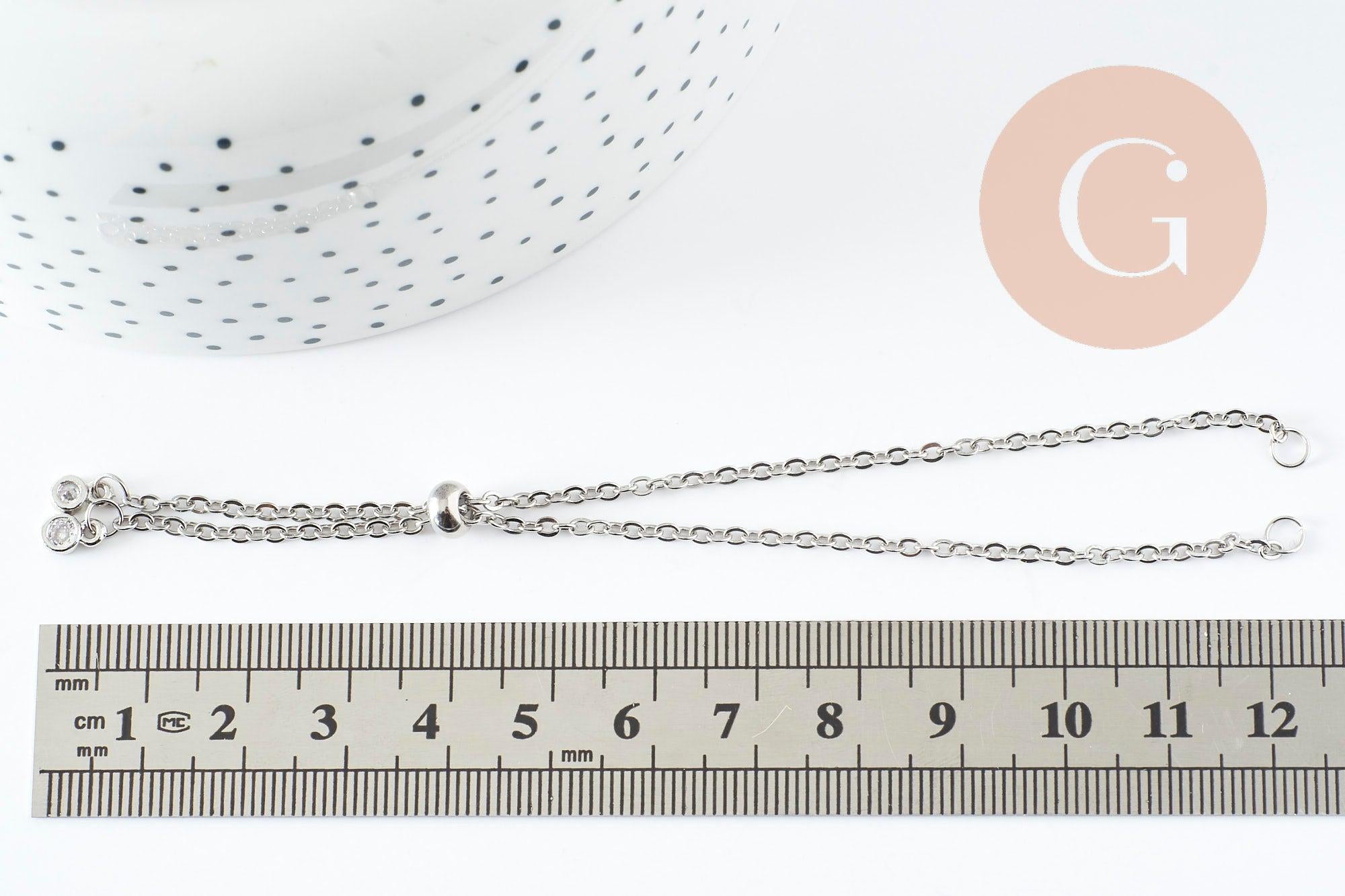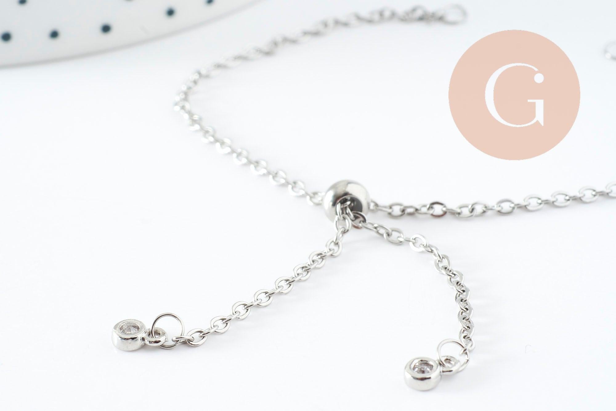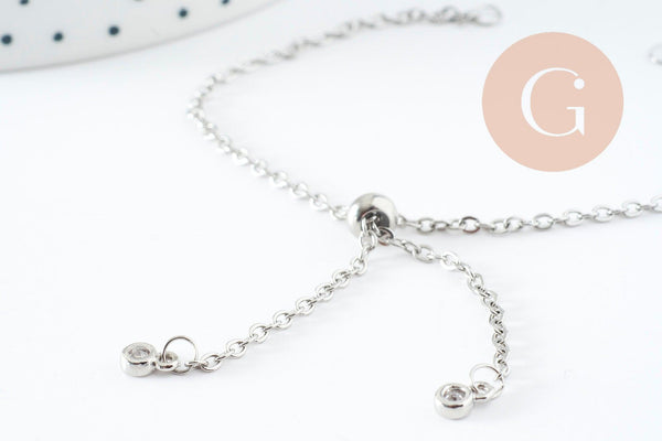 Base de bracelet réglable chaine forçat acier inoxydable platine finition zircon 2mm/ 26.6cm, x1 (G10230)