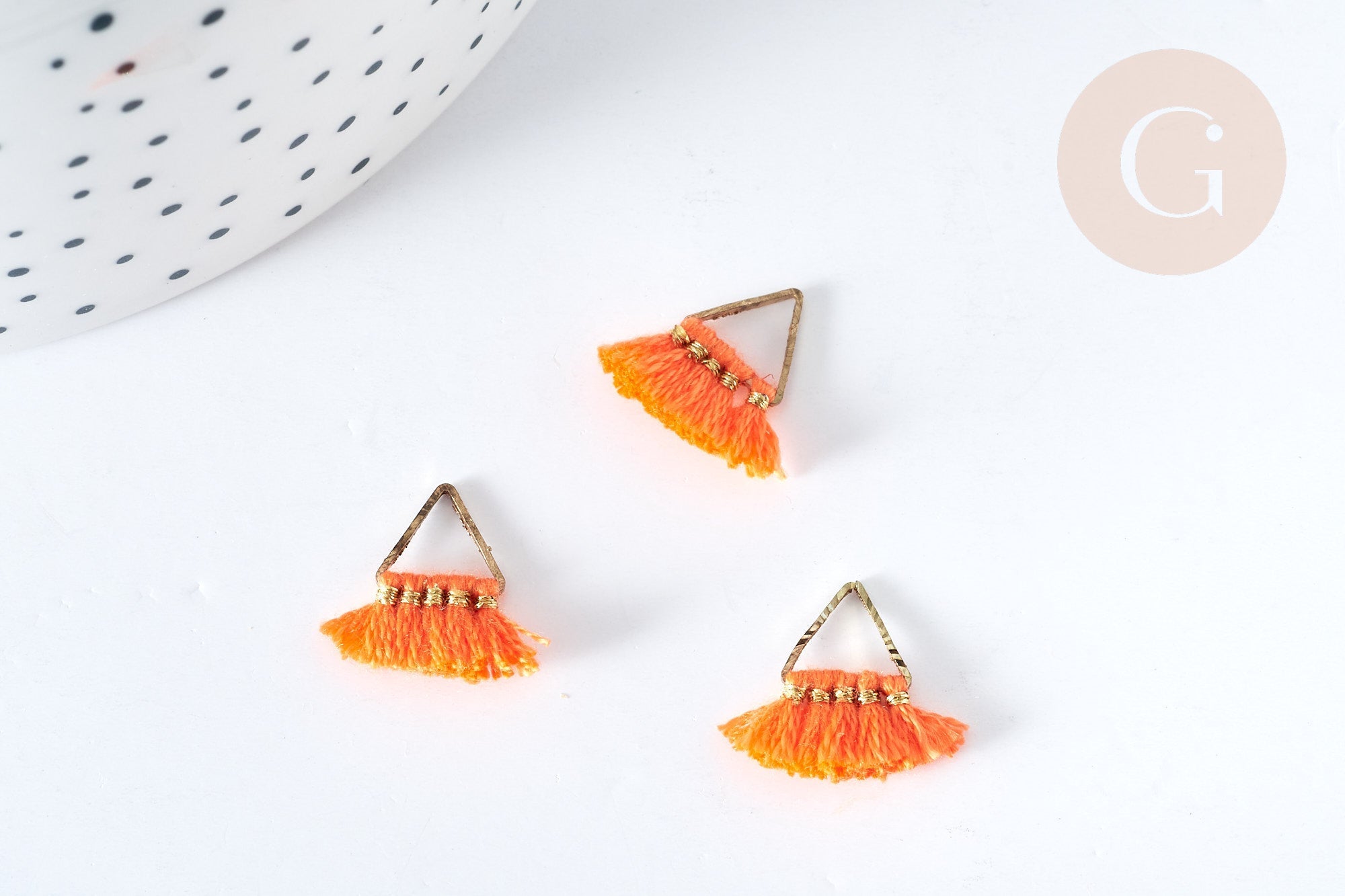 Make high-quality jewelry with this gold-plated brass triangular pendant decorated with 5 mini orange pompoms.