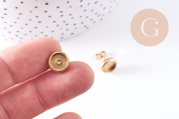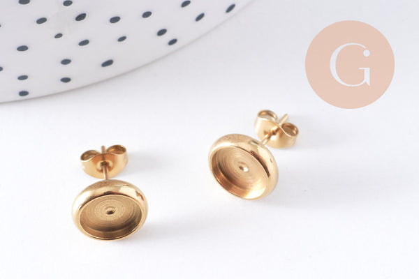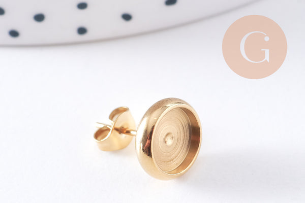 Clous-puces oreille support cabochon 8mm acier 304 inoxydable dore IP, x10 (G10608)
