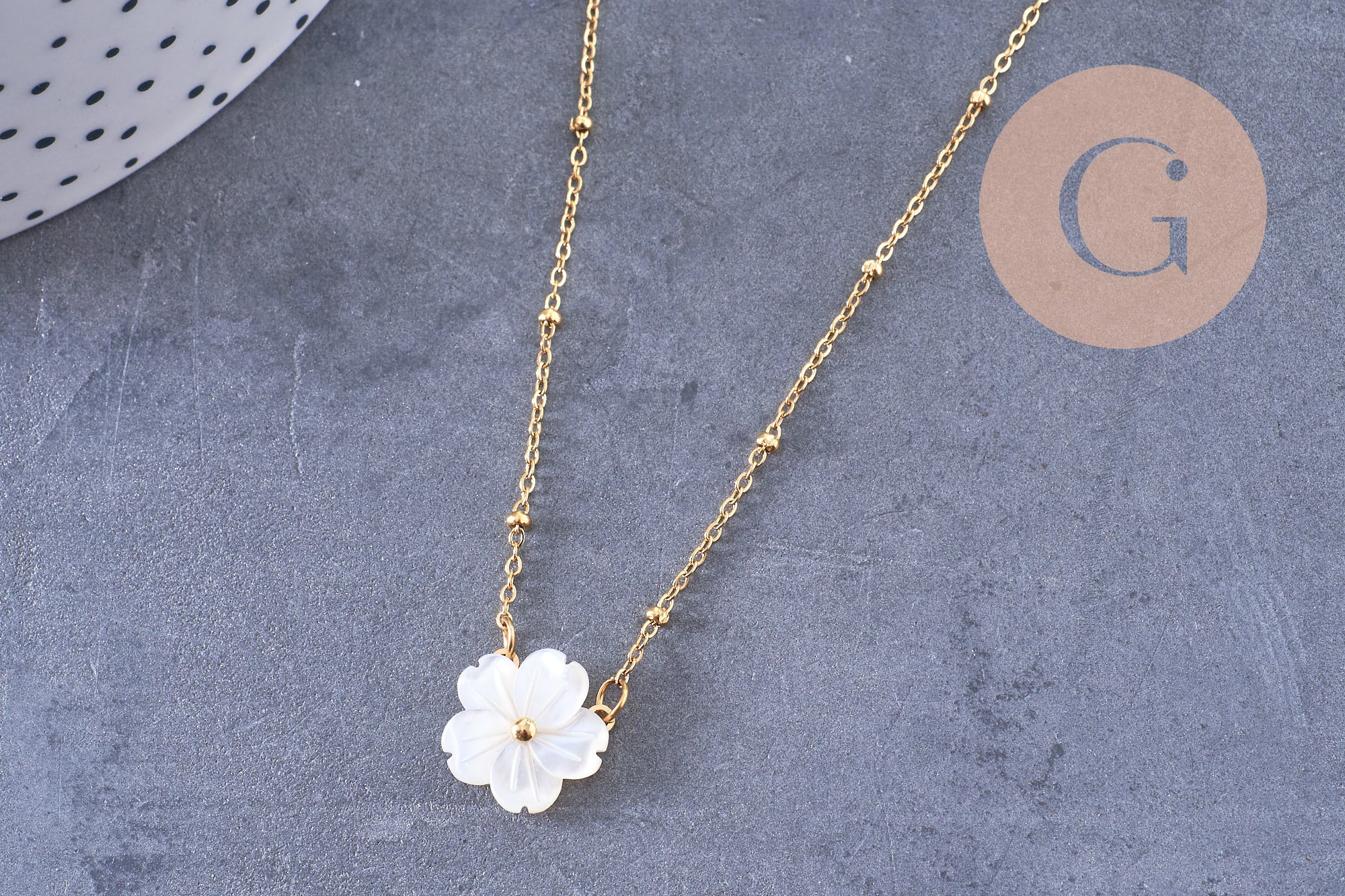 Collier fleur nacre naturelle chaine acier inoxydable doré PVD 18k 45cm, x1 (10581)