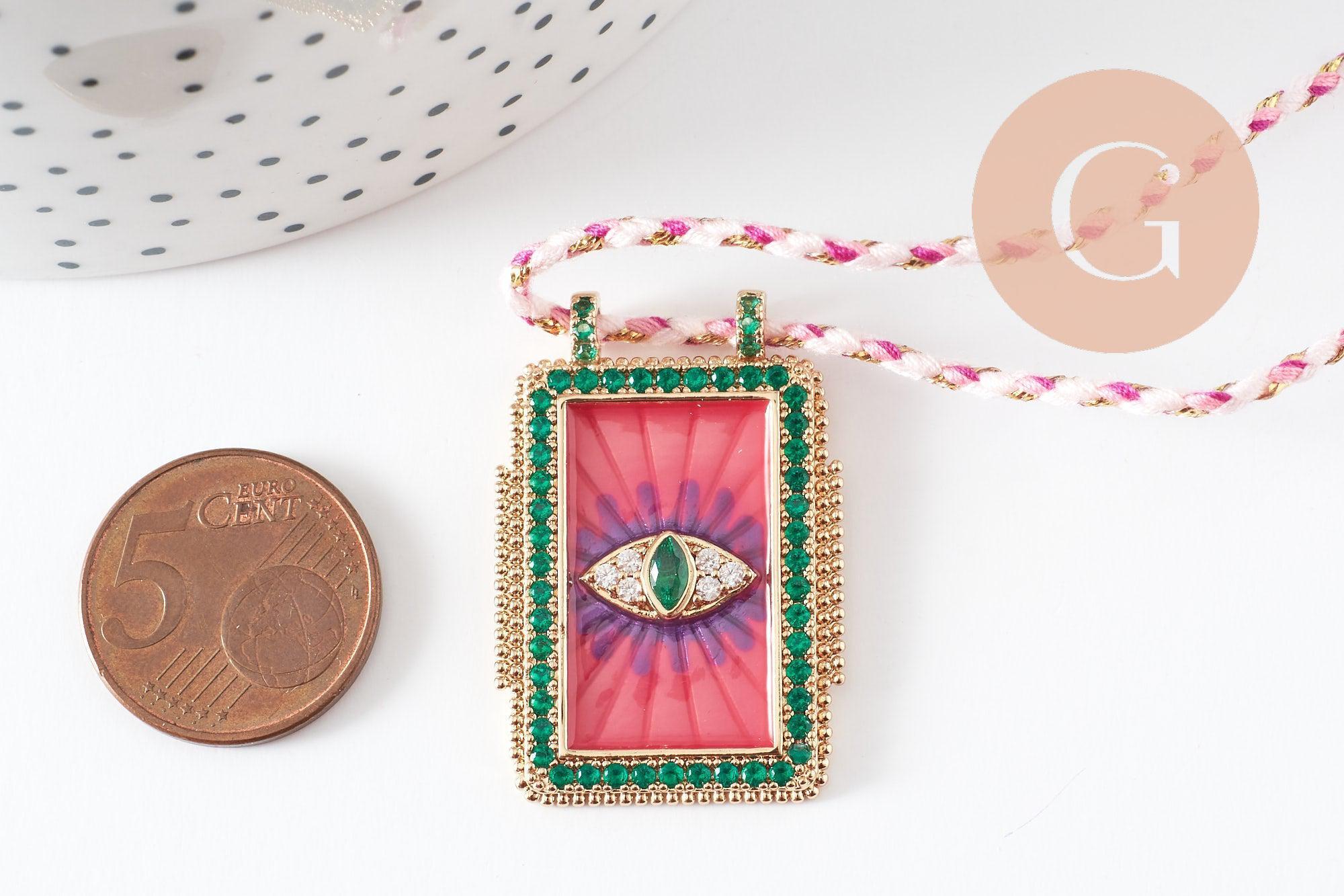 Necklace enameled medallion Eye zircon pink green gold zamac, braided cord necklace 45cm x1 (G9569)