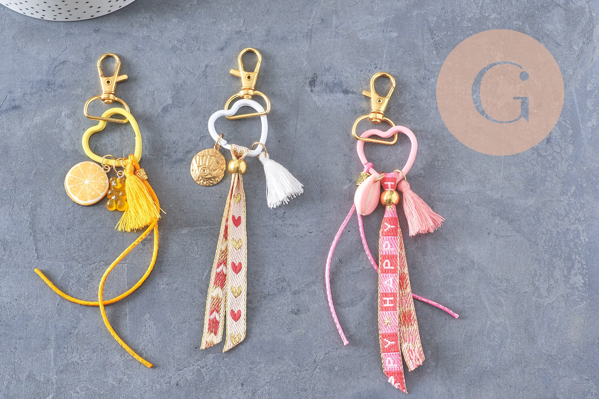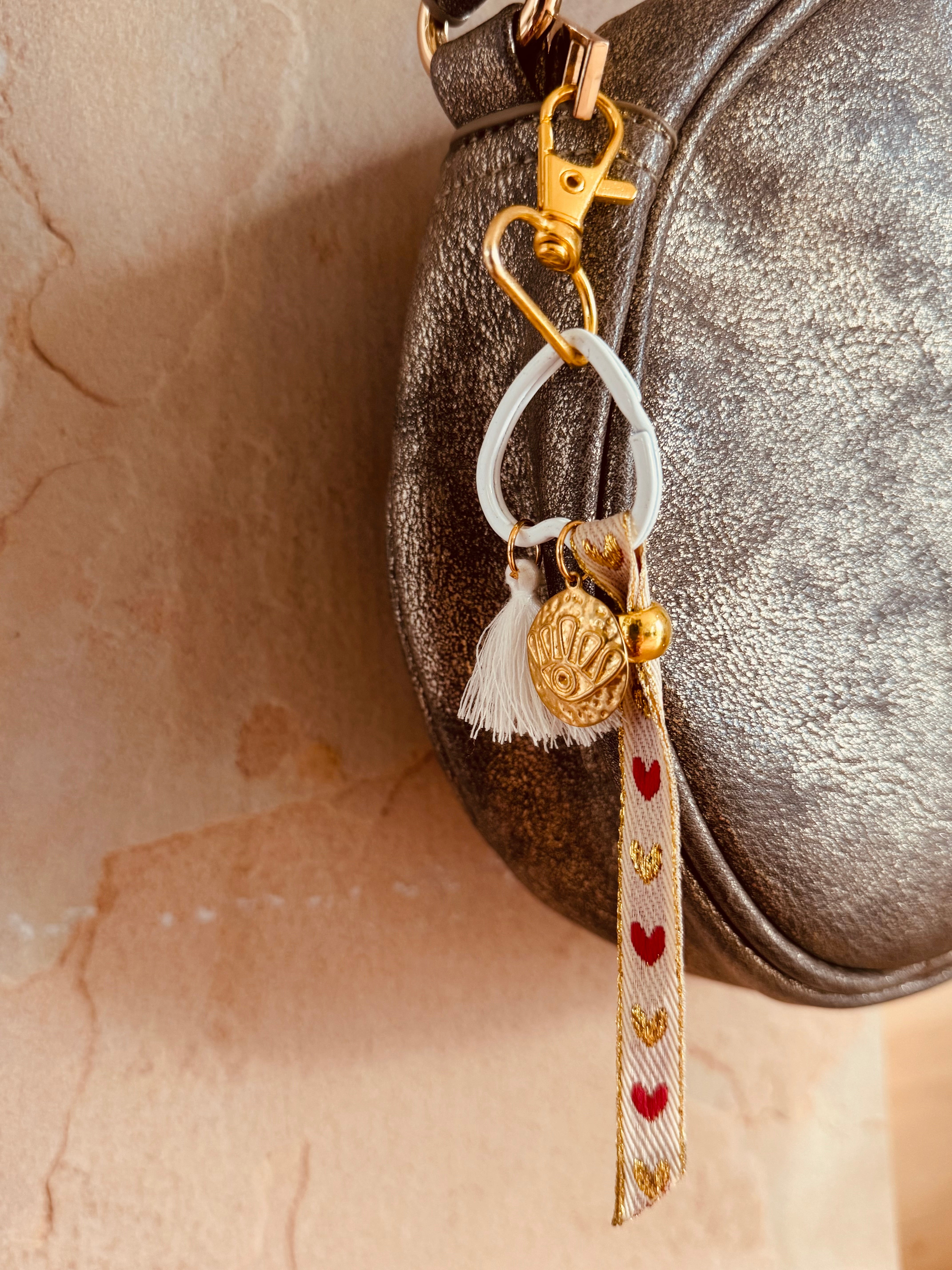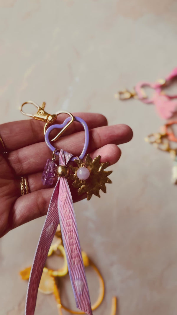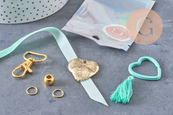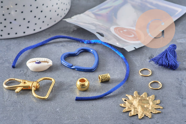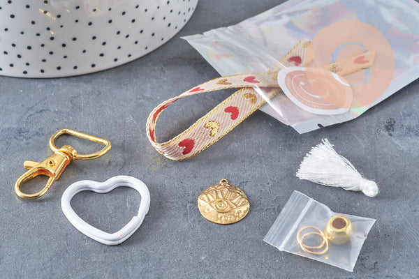 Create a colorful and unique lucky charm with this complete kit! It contains everything you need to make a beautiful lucky charm to hang from your bag, pencil case, or set of keys: colorful heart key ring, gold carabiner, embroidered or velvet ribbons, cords, beads, pendants, and charms.