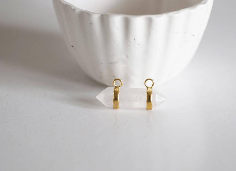 Fall for this rock crystal pendant with its golden support with a double ring You can create magnificent necklaces using this very trendy pendant. The crystal is cut into a point shape. Width: 14mm Length: 32mm Diameter: 10mm Hole: 3mm....