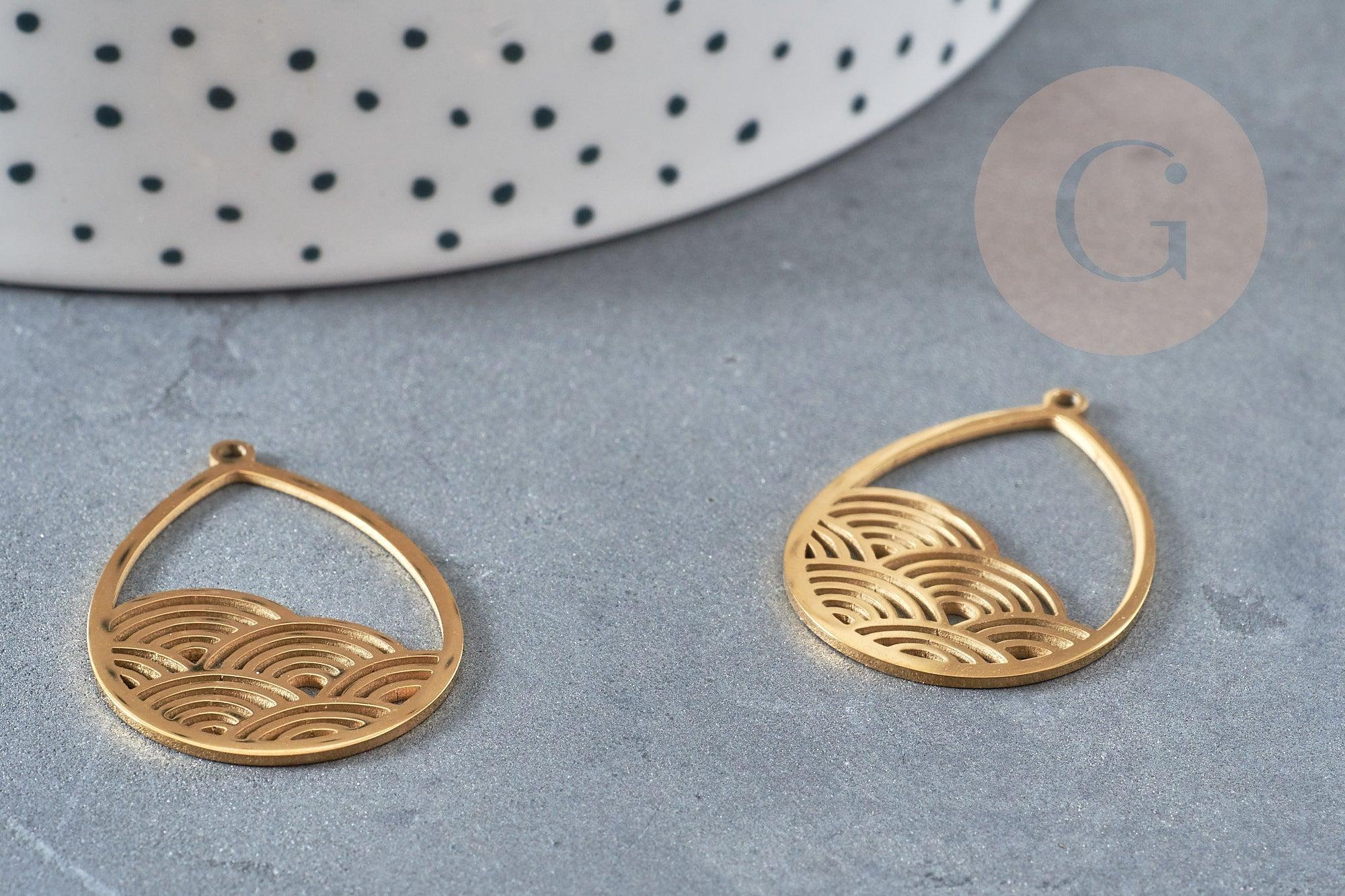A gold-plated steel pendant in the shape of a raindrop , decorated with gold-plated stainless steel waves