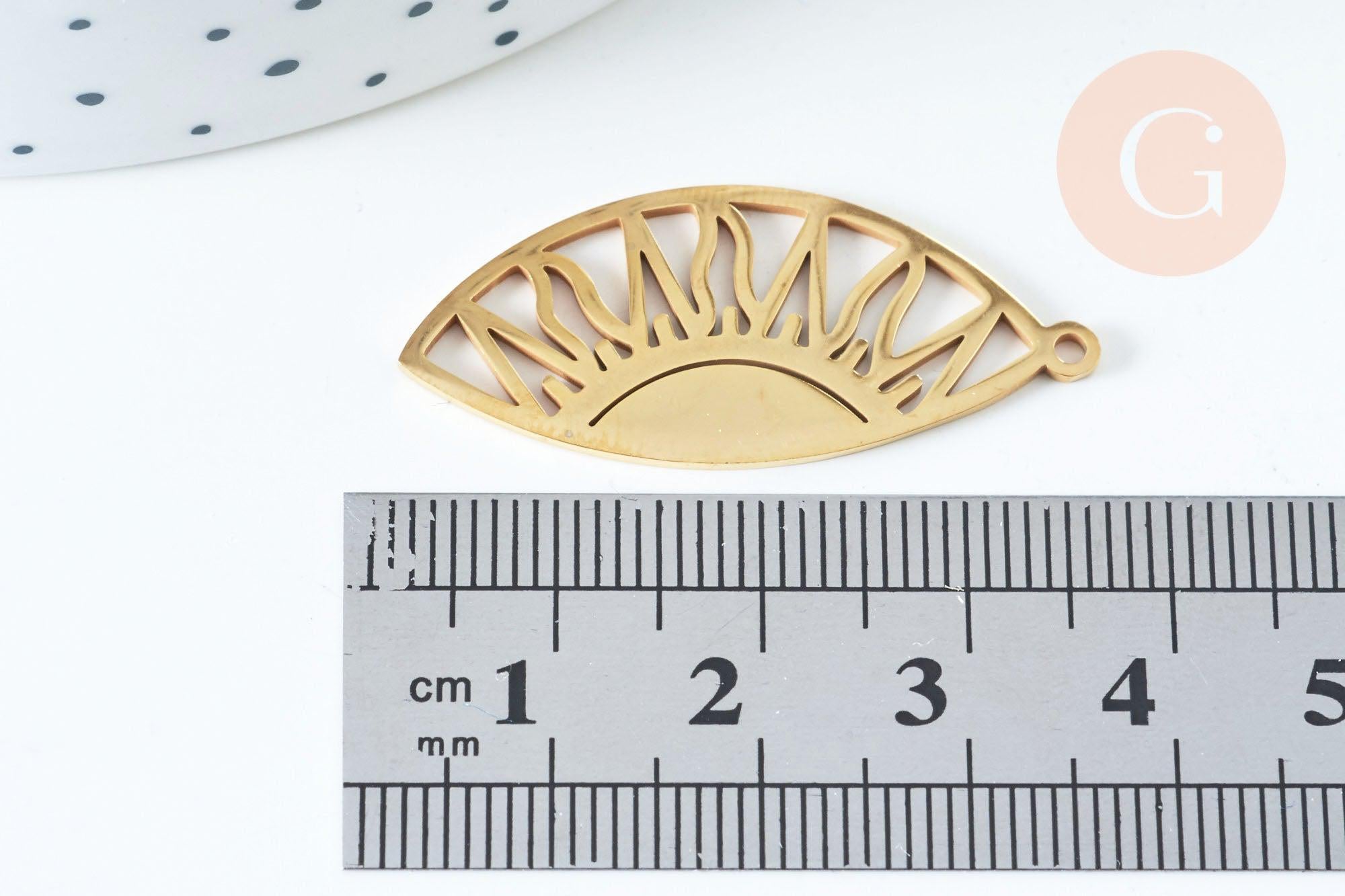 A drop-shaped stainless steel gold pendant incorporating a sun. An adorable gold pendant to use in all your creations.