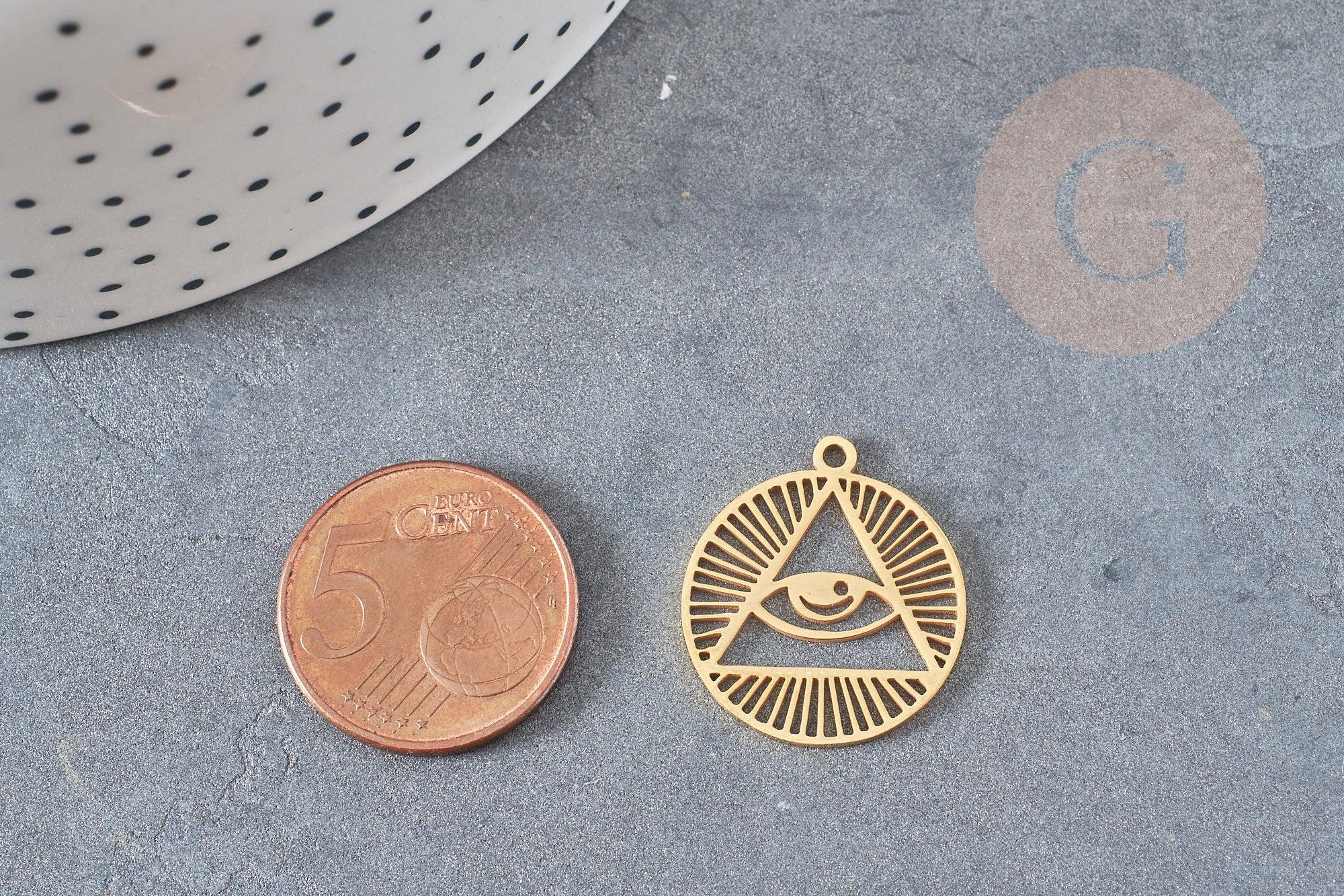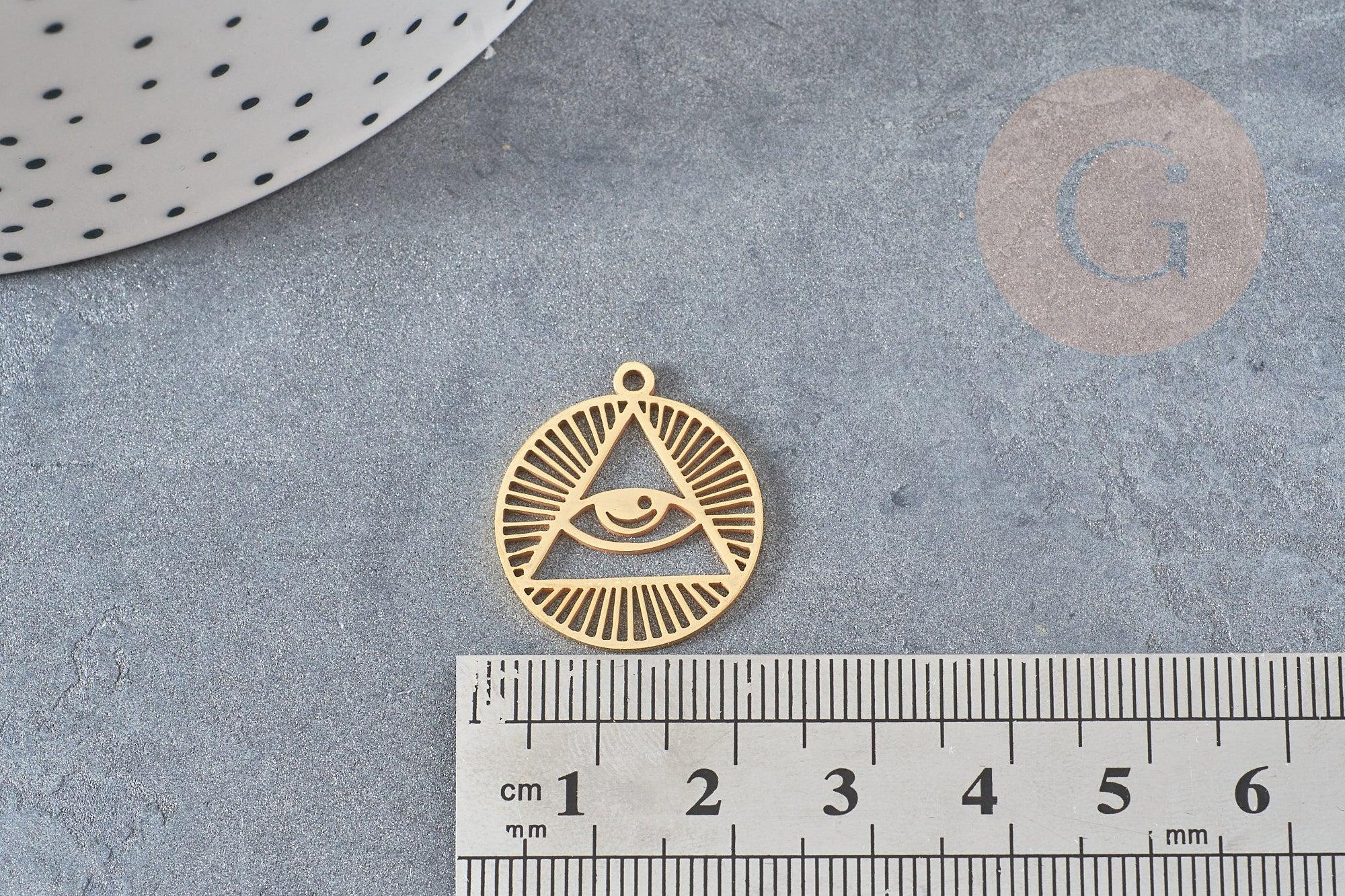 A triangle pendant with a protective eye inside, in gold-plated stainless steel.