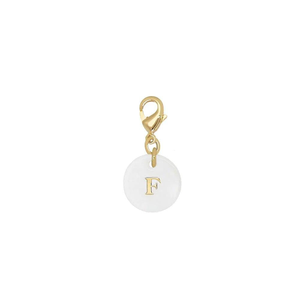A round mother-of-pearl charm pendant with the initial of your first name, to complete a necklace, a sautoir, or earrings.