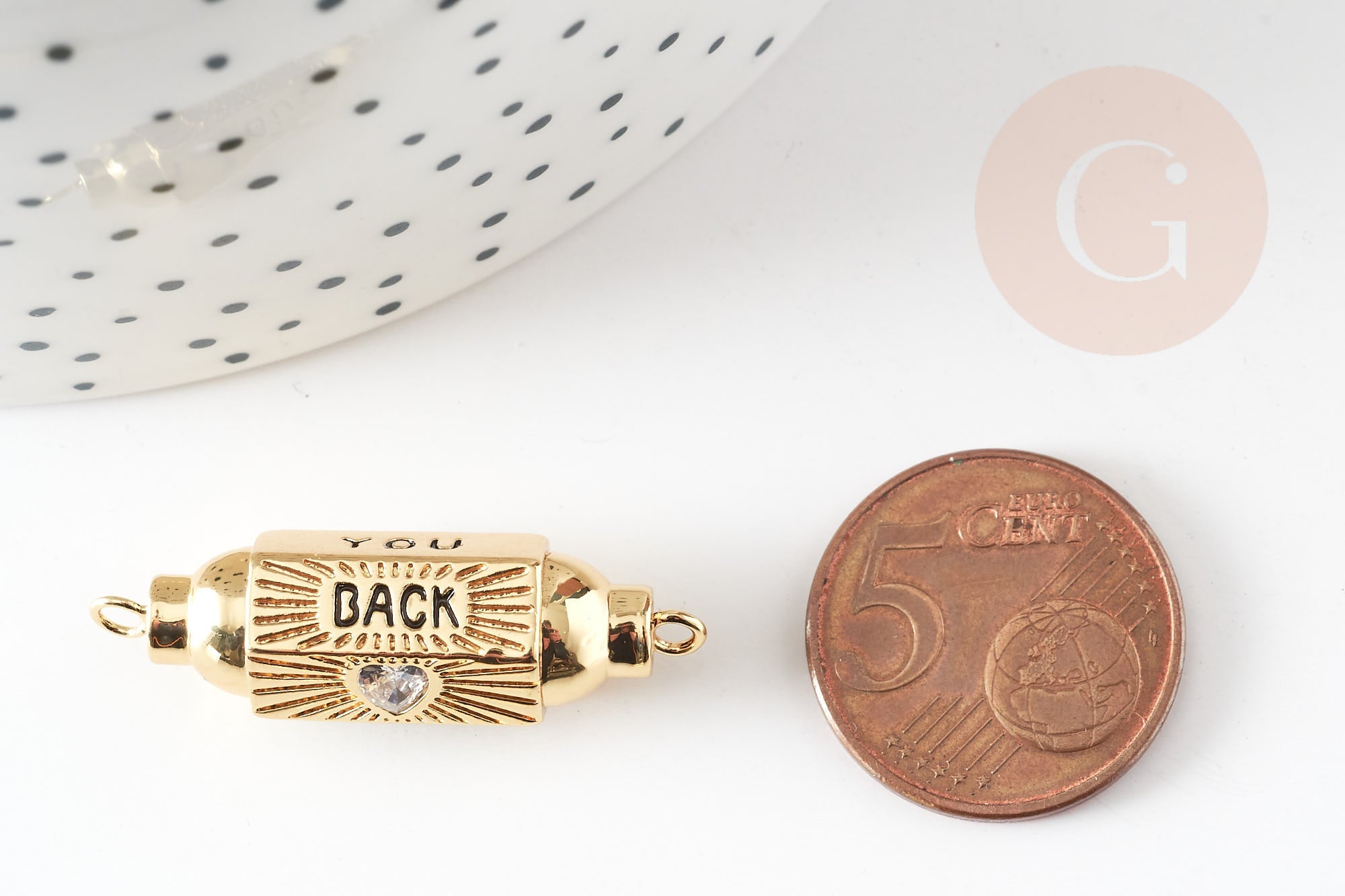 For your trendy talisman bracelets and necklaces, here is a magnificent tube connector in gold-plated brass, enameled in white and decorated with the word "YOU BACK". An optimistic pendant that you can embellish with a stone, pearls on one of our complete chains