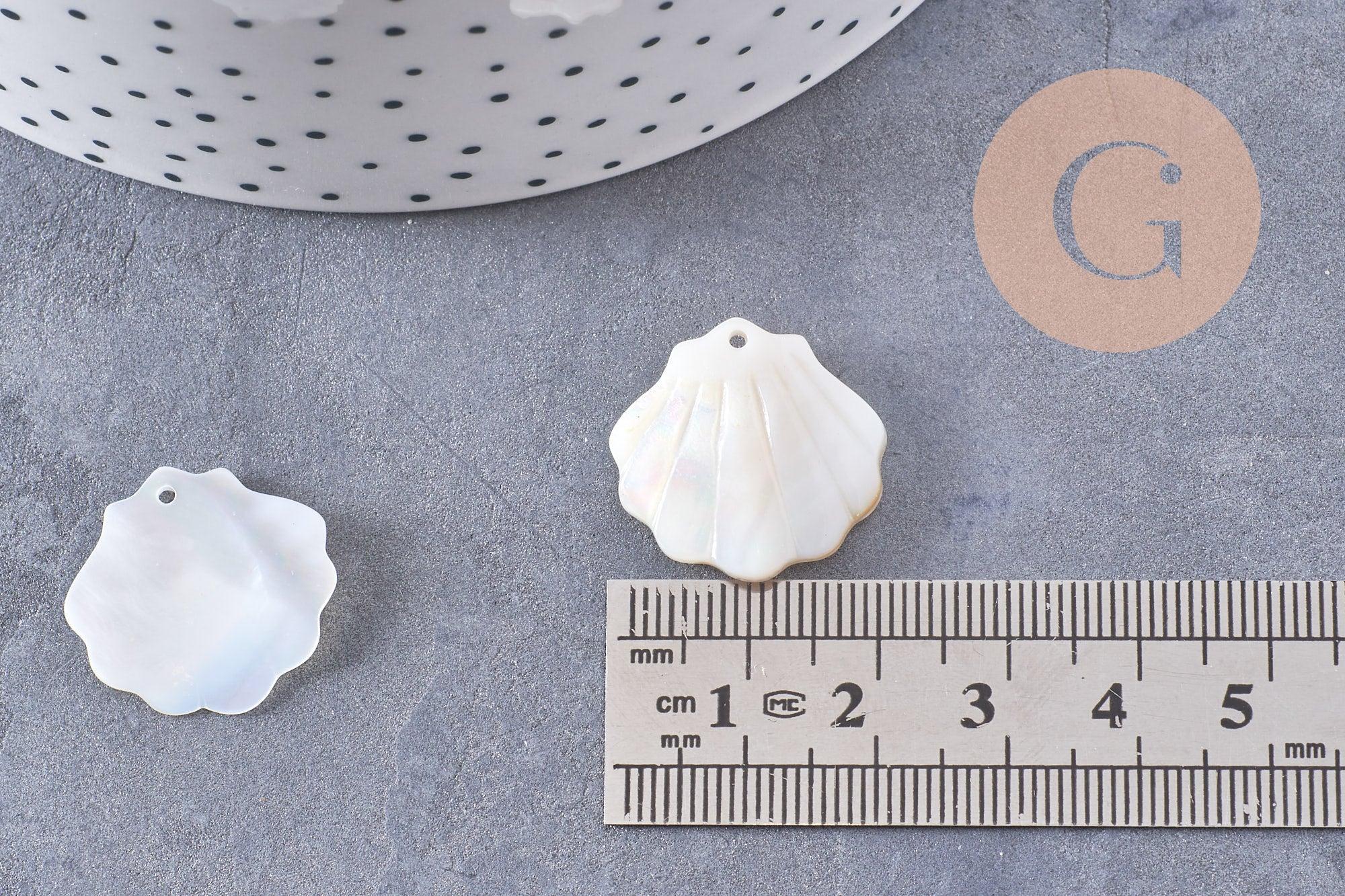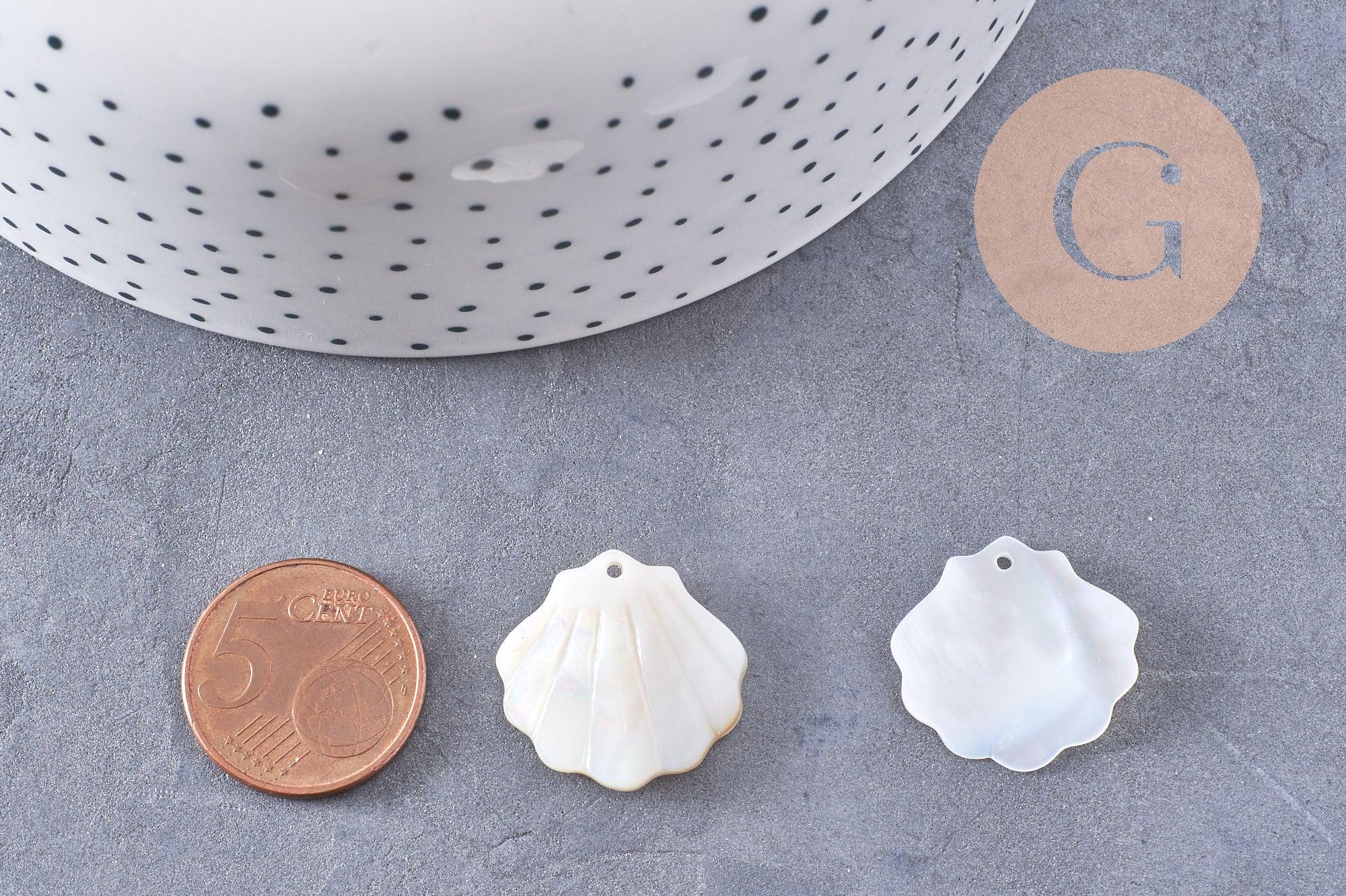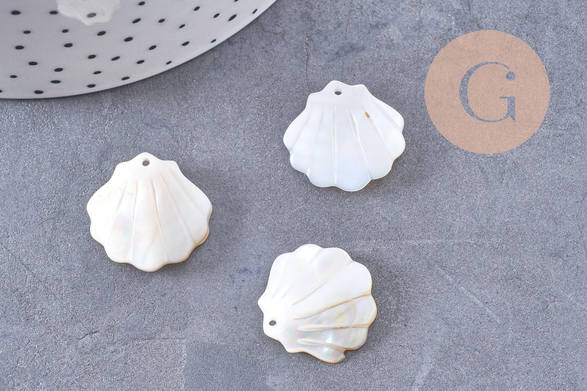 This natural white mother-of-pearl pendant , in the shape of a 21 mm shell , reveals an iridescent shine with subtle and elegant reflections.