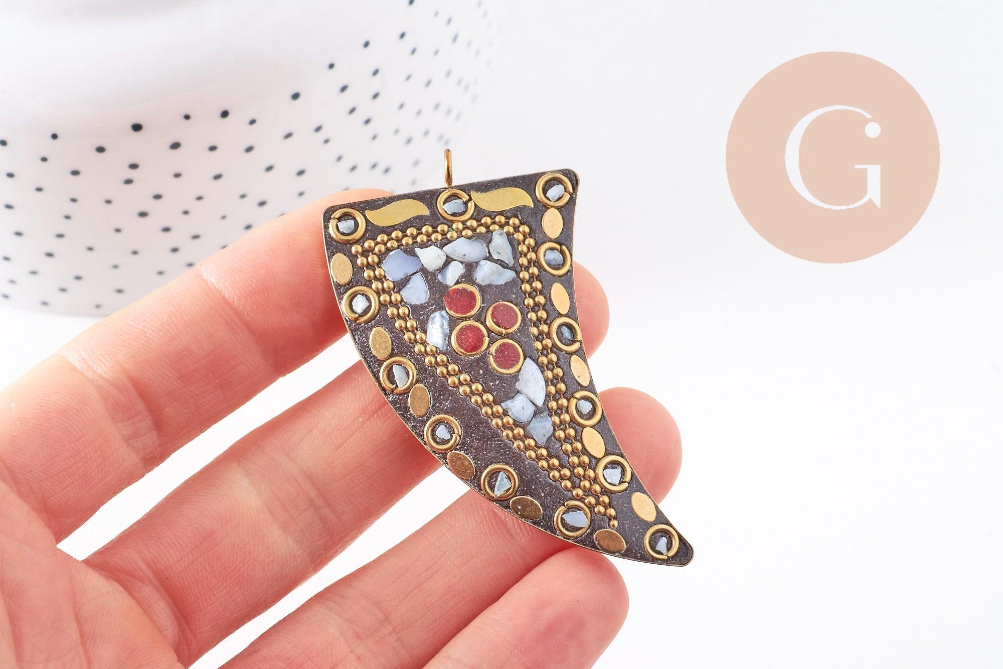 The stone horn pendant is Tibetan style and measures 61mm, making it a generously sized accessory that will attract attention. The raw brass adds a touch of authenticity and rusticity to the whole, while the natural stones give a touch of color and texture to the whole.