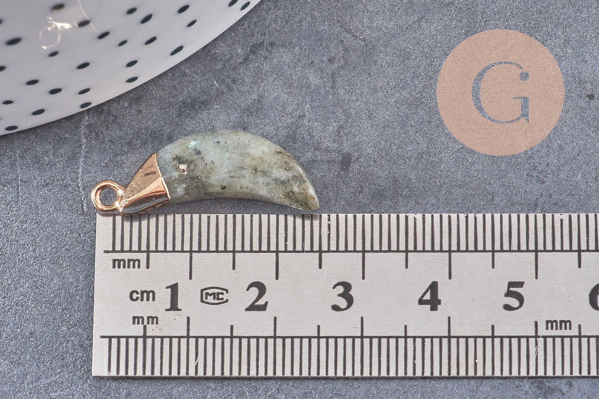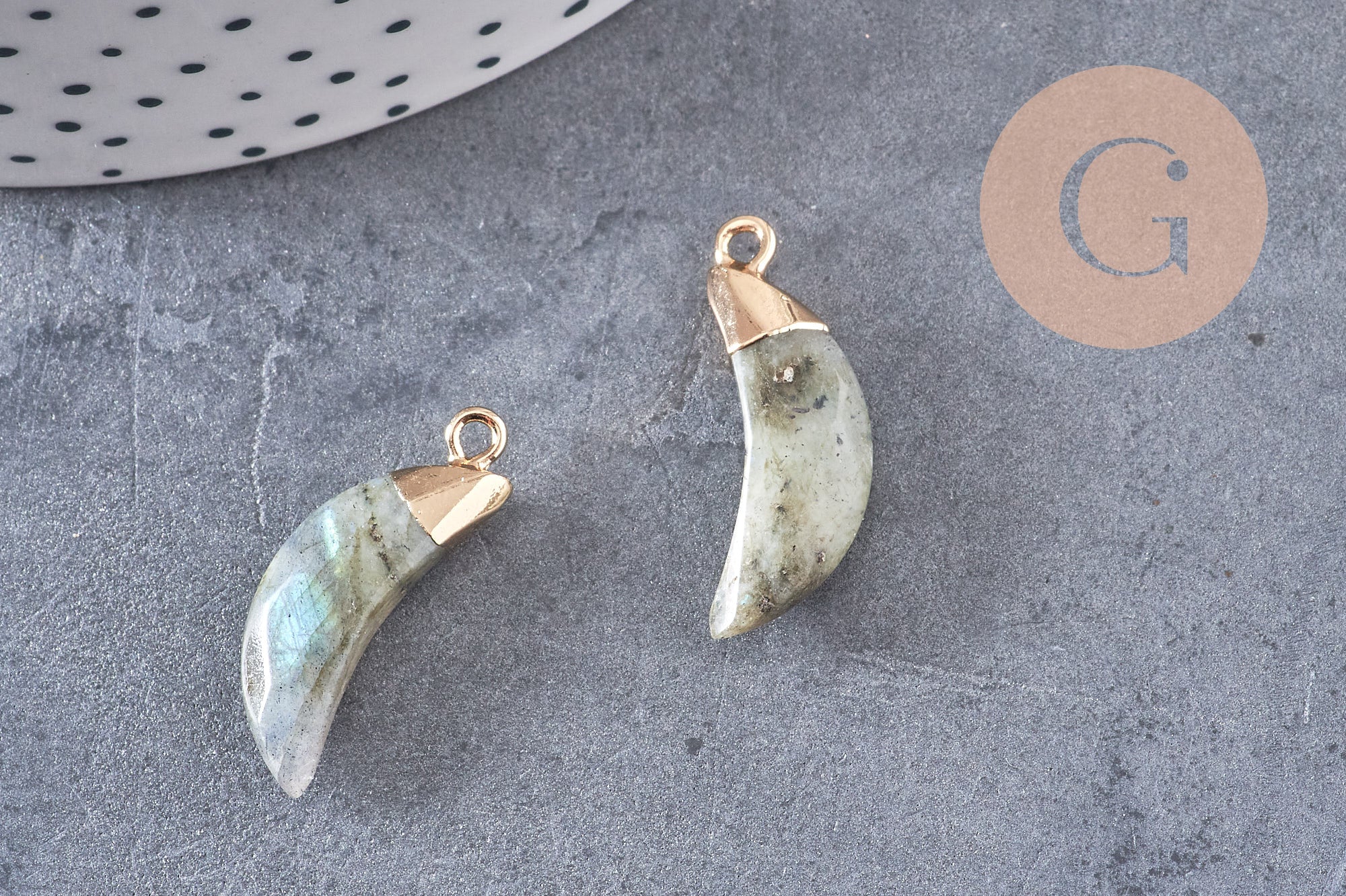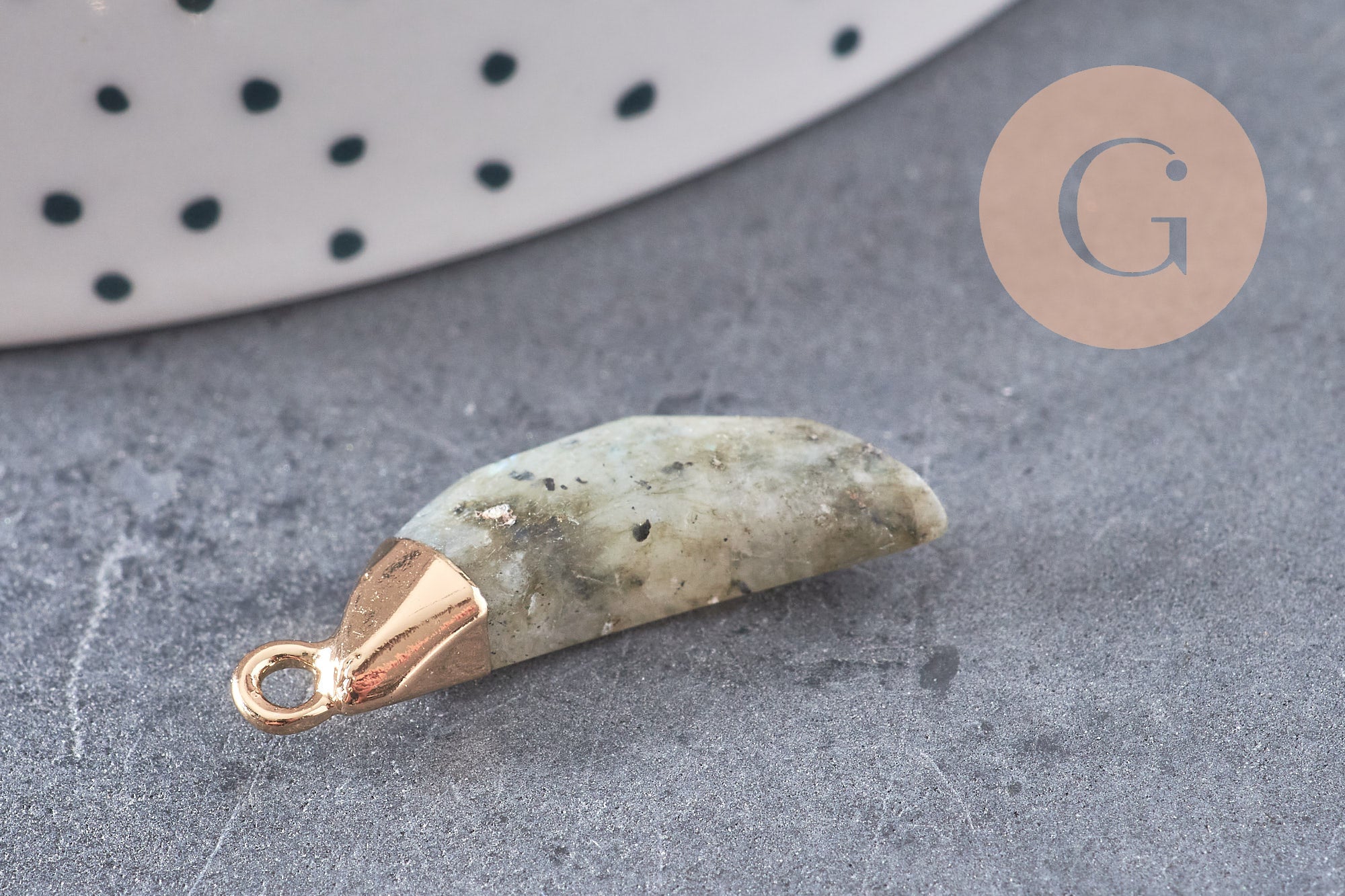 Fall for this little labradorite pendant with its golden support.
